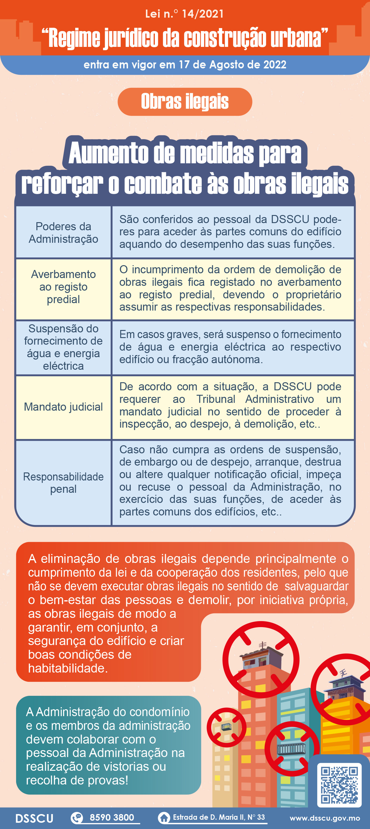 A Lei n.º 14/2021 (Regime jurídico da construção urbana) entrará em vigor em 17 de Agosto de 2022. Em relação às soluções dos problemas inerentes às obras ilegais, esta lei para além de agravar as multas, cria também várias medidas de modo a redobrar os esforços para as combater, nomeadamente a introdução de responsabilidades penais, o averbamento da existência de obras ilegais ao registo predial e em casos graves, a suspensão de fornecimento de água e energia eléctrica. Os funcionários do governo poderão também proceder à inspecção, despejo, demolição, entre outros, mediante mandato judicial.