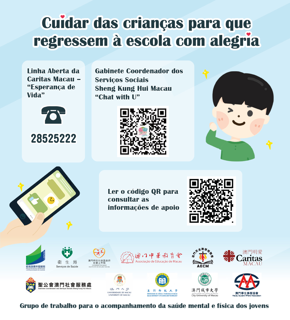 Tendo em conta que o novo ano lectivo terá início em breve, a Direcção dos Serviços de Educação e de Desenvolvimento da Juventude (DSEDJ) apela a todos os pais/encarregados de educação e estudantes para prepararem mais cedo o início do novo ano lectivo, prestando atenção às informações mais actualizadas relativas ao trânsito e às condições meteorológicas e sobre a epidemia divulgadas pelo Governo da RAEM.