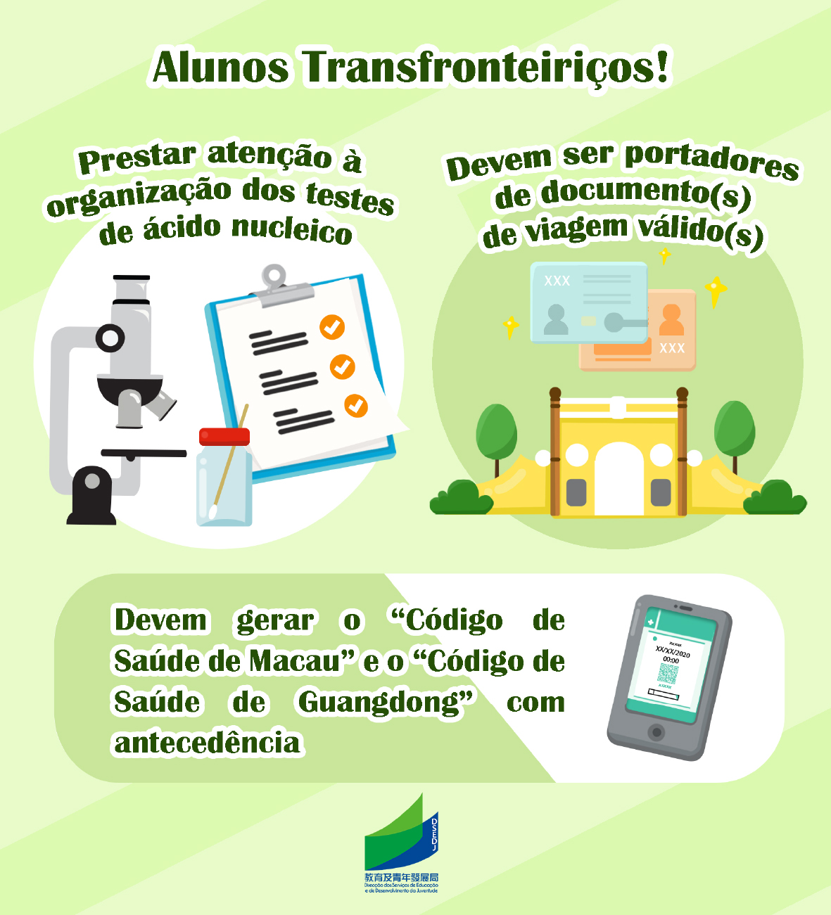 Para garantir as condições de saúde e de segurança dos docentes e estudantes, a DSEDJ anunciou, na primeira metade de Agosto, que os estudantes e docentes e funcionários das instituições de ensino superior e das escolas de ensino não superior têm de regressar ao seu local de residência permanente (Macau, Zhuhai ou Zhongshan) no prazo de 10 dias antes da data de início das aulas, e possuir, no dia de início de aulas, um comprovativo da colheita de amostra do teste de ácido nucleico, realizada dentro de 72 horas antes (3 dias). A fim de facilitar a marcação, foi lançado um sistema de marcação de teste de ácido nucleico exclusivo para docentes e estudantes ( https://app.ssm.gov.mo/studentrnabook ). Estes têm de efectuar a marcação para poderem fazer o teste, não devem chegar demasiado cedo (com antecedência de 30 minutos) nem chegar atrasado, no sentido de evitar a concentração das pessoas. O resultado deste teste não serve para passar na fronteira, nem substitui a realização periódica do teste de ácido nucleico para os grupos profissionais chave. Os estudantes, os docentes e funcionários transfronteiriços podem realizar o teste em Zhuhai ou Zhongshan, e não precisam de regressar a Macau para o efeito. Além disso, os docentes, funcionários dos estabelecimentos de ensino superior e não superior, bem como estudantes das instituições de ensino superior, devem apresentar o comprovativo do esquema vacinal completo contra COVID-19 ou apresentar, semanalmente, os resultados negativos do teste de ácido nucleico em sete dias.