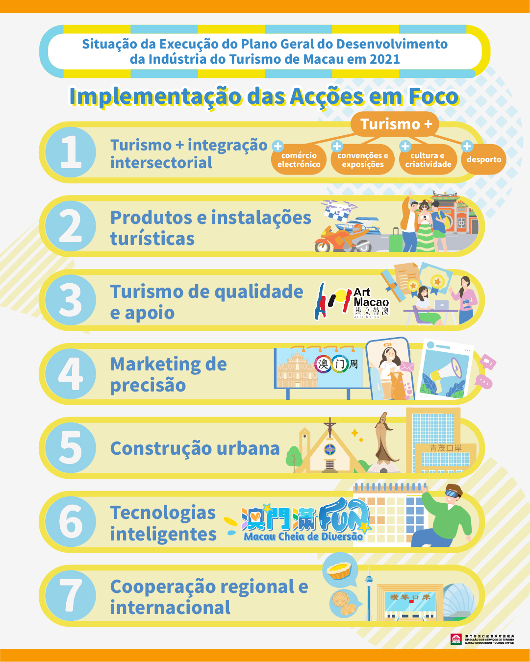 O Plano Geral define claramente uma direcção de desenvolvimento, tendo como eixo principal acções focadas em sete áreas, empenhando-se em implementar a integração intersectorial com “turismo + comércio electrónico”, “turismo + desporto”, “turismo + convenções e exposições”, indústrias culturais e criativas, entre outros sectores. Em simultâneo, empenha-se na optimização dos produtos e instalações turísticas; no fortalecimento do turismo de qualidade e na cooperação; promoção de marketing de precisão; construção urbana; tecnologias inteligentes e cooperação regional e internacional. A situação da implementação em 2021 é a seguinte: