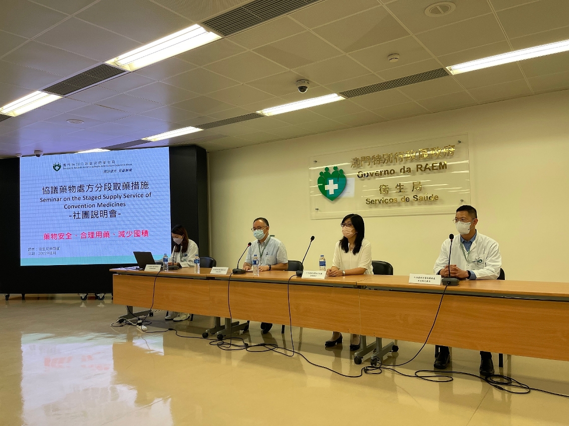 Os Serviços de Saúde lançam medidas de levantamento de medicamentos, por fases em farmácias convencionadas, a fim de que os utentes obtenham um conhecimento profundo sobre o tratamento de medicamentos, com a promoção do uso seguro de medicamentos, a redução do desperdício causado pelo açambarcamento de medicamentos, o reforço do contacto e a comunicação entre os farmacêuticos e os utentes, a fim de colocar em evidência e com a maior brevidade possível, a questão da administração de medicamentos por parte dos utentes, bem como proceder à intervenção oportuna e aumentar a eficácia do tratamento por medicamentos, de modo a elevar os serviços profissionais farmacêuticos. Na reunião, os representantes dos Serviços de Saúde apresentaram detalhadamente os quatro pontos principais das medidas de levantamento de medicamentos por fases