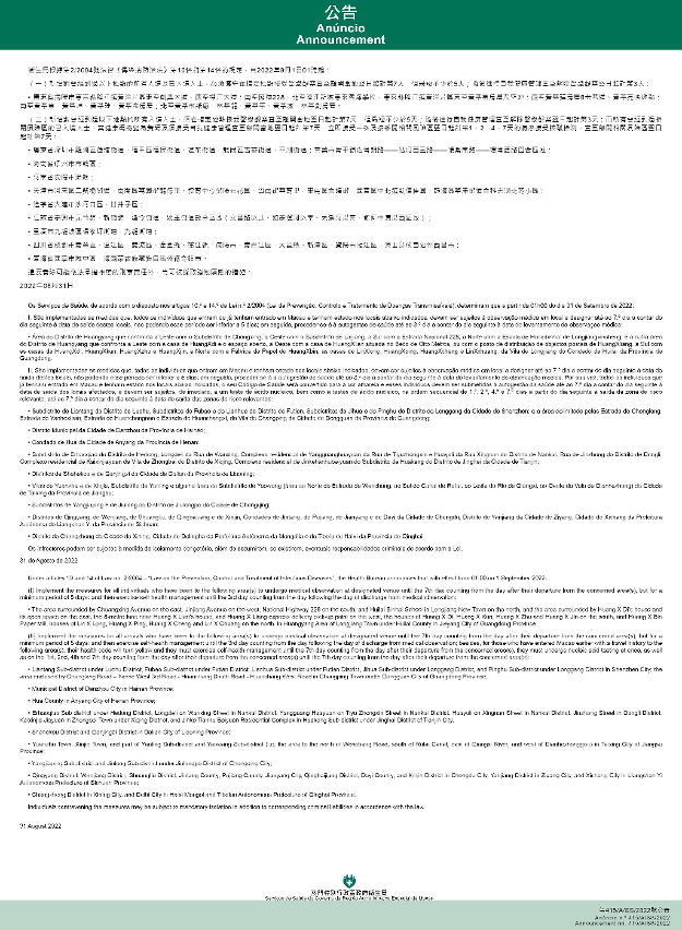 Tendo em consideração a evolução epidemiológica mais actualizada no Interior da China, os Serviços de Saúde, de acordo com o disposto nos artigos 10.º e 14.º da Lei n.º 2/2004 (Lei de Prevenção, Controlo e Tratamento de Doenças Transmissíveis), determinam que a partir da 01h00 do dia 01 de Setembro de 2022, são implementadas ou canceladas as medidas antiepidémicas para quem tenha estado em diversas áreas do Interior da China: