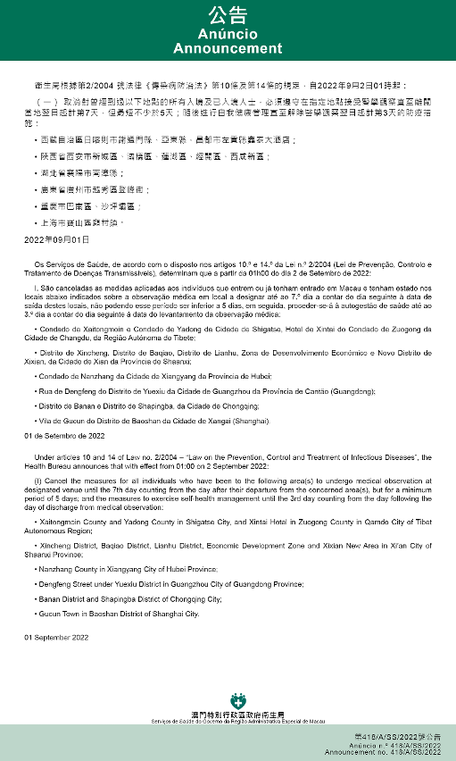 Tendo em consideração a evolução epidemiológica mais actualizada no Interior da China, os Serviços de Saúde, de acordo com o disposto nos artigos 10.º e 14.º da Lei n.º 2/2004 (Lei de Prevenção, Controlo e Tratamento de Doenças Transmissíveis), determinam que a partir da 01h00 do dia 2 de Setembro de 2022, são implementadas ou canceladas as medidas antiepidémicas para quem tenha estado em diversas áreas do Interior da China: