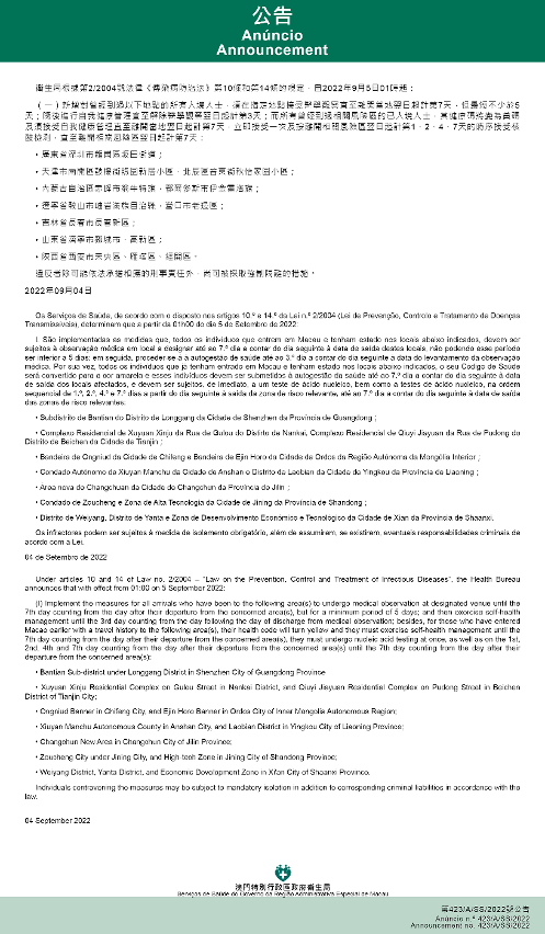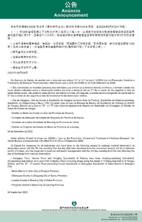 Tendo em consideração a evolução epidemiológica mais actualizada no Interior da China, os Serviços de Saúde, de acordo com o disposto nos artigos 10.º e 14.º da Lei n.º 2/2004 (Lei de Prevenção, Controlo e Tratamento de Doenças Transmissíveis), determinam que a partir da 01h00 do dia 5 de Setembro de 2022, são implementadas ou canceladas as medidas antiepidémicas para quem tenha estado em diversas áreas do Interior da China: