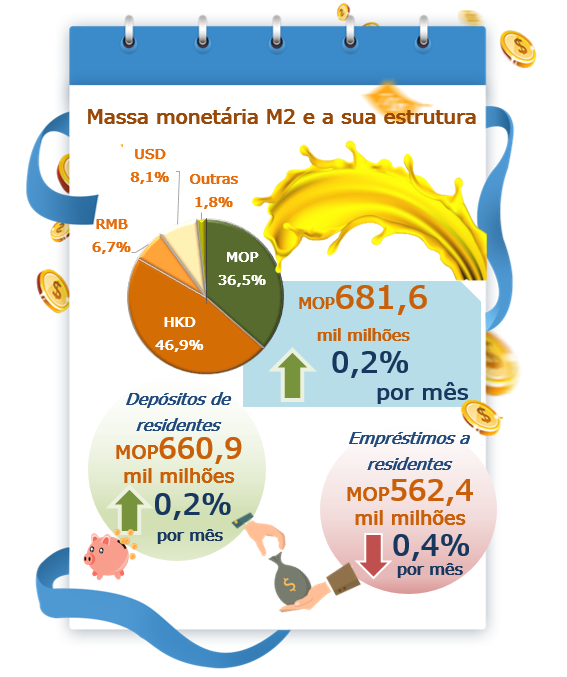 Quando comparado com o mês anterior, a circulação monetária cresceu 1,3%, mas os depósitos à ordem decresceram 3,6%. M1, assim, decresceu 2,2%, relativamente ao mês anterior. Por outro lado, as responsabilidades quase monetárias cresceram 0,5%. A soma destes dois elementos, ou seja, M2, cresceu 0,2% relativamente ao mês anterior, tendo atingido MOP681,6 mil milhões. Quando comparado com o período homólogo de 2021, M1 e M2 decresceram 6,3% e 1,2%, respectivamente. A proporção da pataca (MOP), dos dólares de Hong Kong (HKD), dos renminbi (RMB) e dos dólares dos Estados Unidos (USD) registou os “pesos” de 36,5%, 46,9%, 6,7% e 8,1%, respectivamente, em M2.