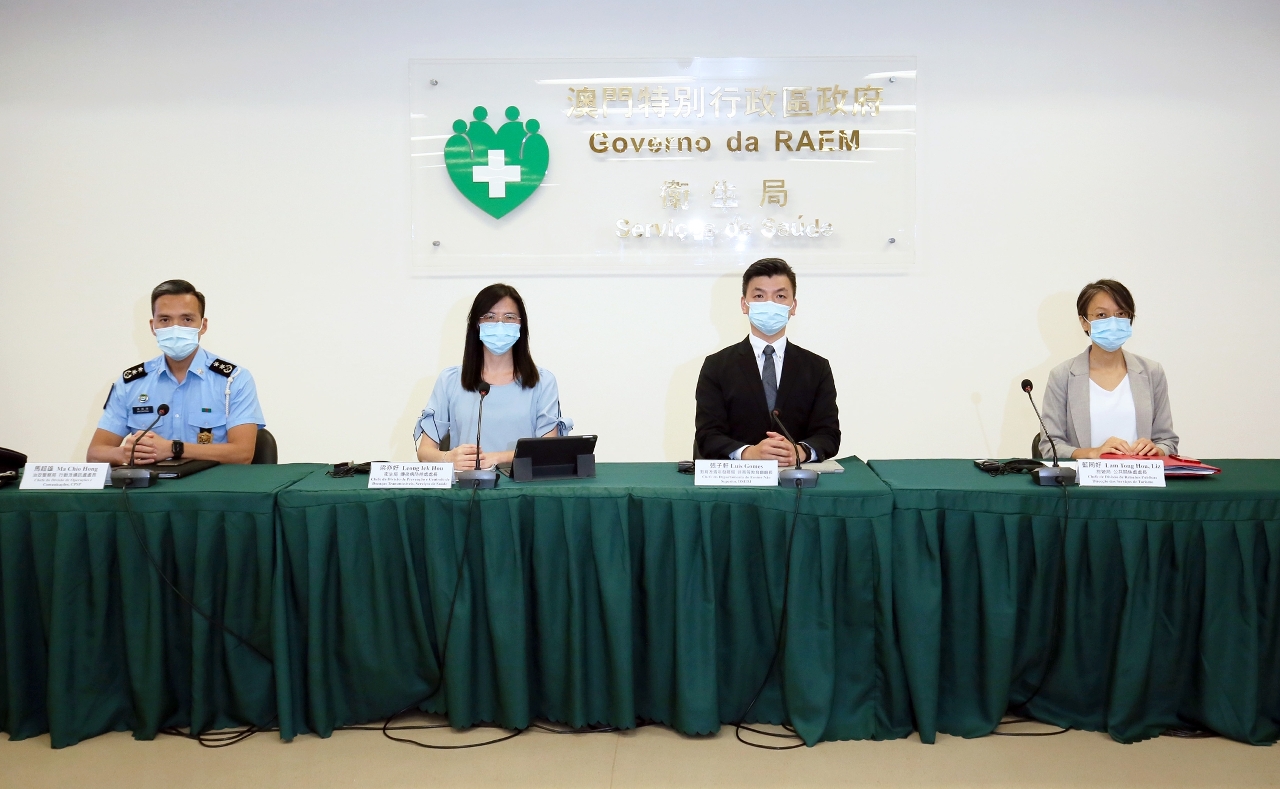Estiveram presentes na conferência de imprensa: o Chefe do Departamento do Ensino Não Superior da Direcção dos Serviços de Educação e de Desenvolvimento da Juventude, Dr. Cheong Chi Hin, a Coordenadora do Núcleo de Prevenção de Doenças Infecciosas e Vigilância de Doença do Centro de Prevenção e Controlo da Doença dos Serviços de Saúde, Dr.ª Leong Iek Hou. o Chefe da Divisão de Operações e Comunicações do Corpo de Polícia de Segurança Pública, Dr. Ma Chio Hong e a Chefe da Divisão de Relações Públicas da Direcção dos Serviços de Turismo, Dr.ª Lam Tong Hou.