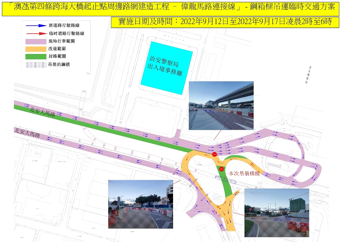 Em coordenação com os trabalhos de elevação e transporte de viga caixão de aço do viaduto da «Empreitada de construção da rede viária na periferia dos pontos de partida e de chegada da quarta ponte Macau-Taipa – Ligação da Av. Wai Long», no período entre 12 e 17 de Setembro de 2022, das 02:00 horas até 06:00 horas, o troço da Rotunda de Pac On, junto ao cruzamento da Avenida do Porto de Pac On será vedado ao trânsito. Nesse período, a Rotunda de Pac On será temporariamente aberta ao trânsito e os veículos no sentido Terminal Marítimo para a Estrada de Pac On poderão circular na Rotunda de Pac On em direcção ao aeroporto (vide anexo), pelo que se apela aos condutores tomarem a devida atenção à sinalização do local.