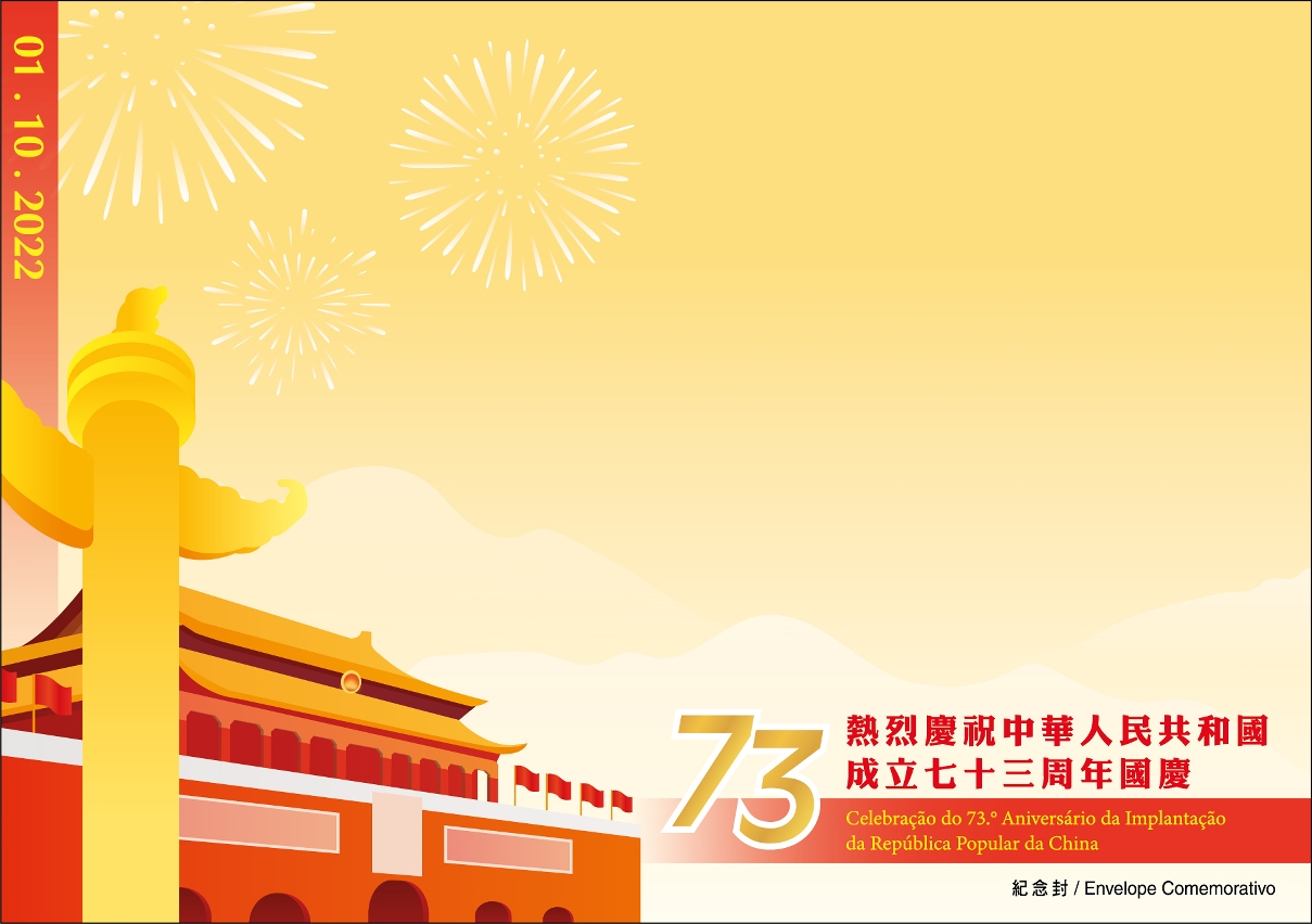 Para assinalar o 73.º Aniversário da Implantação da República Popular da China, a Direcção dos Serviços de Correios e Telecomunicações informa que, no dia 1 de Outubro de 2022, haverá um Posto de Correio Temporário com o carimbo comemorativo “Celebração do 73.º Aniversário da Implantação da República Popular da China”, instalado na Loja de Filatelia da Estação Central, das 9h00 às 14h00 horas. No mesmo local, estarão à venda envelopes comemorativos ao preço unitário de MOP3,00.