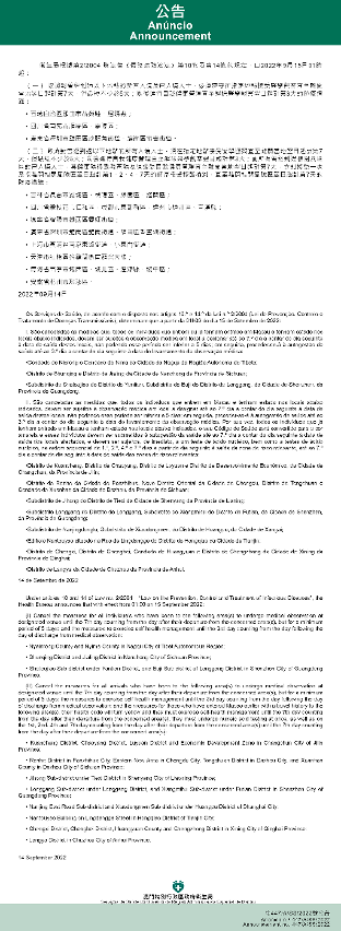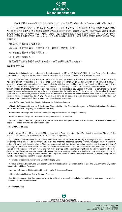 Tendo em consideração a evolução epidemiológica mais actualizada no Interior da China, os Serviços de Saúde, de acordo com o disposto nos artigos 10.º e 14.º da Lei n.º 2/2004 (Lei de Prevenção, Controlo e Tratamento de Doenças Transmissíveis), determinam que a partir da 01h00 do dia 15 de Setembro de 2022, são implementadas ou canceladas as medidas antiepidémicas para quem tenha estado em diversas áreas do Interior da China: