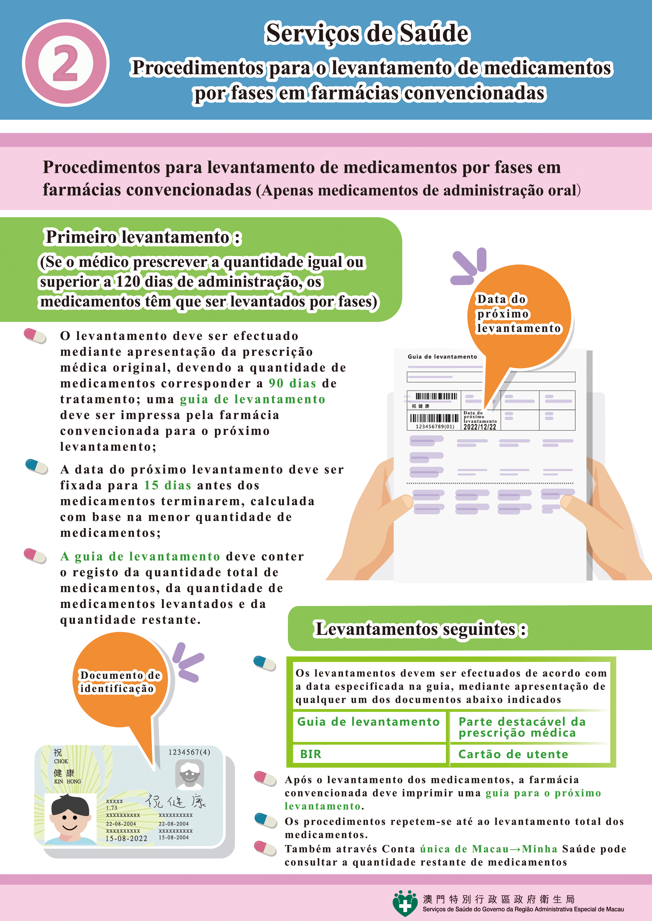 Os utentes devem conservar, de forma adequada, a guia do próximo levantamento, porque, na qual, estão registadas a quantidade total de medicamentos, a quantidade de medicamentos levantados, bem como a quantidade restante. Eles podem dirigir-se a qualquer farmácia convencionada segundo a data especificada na guia de levantamento.