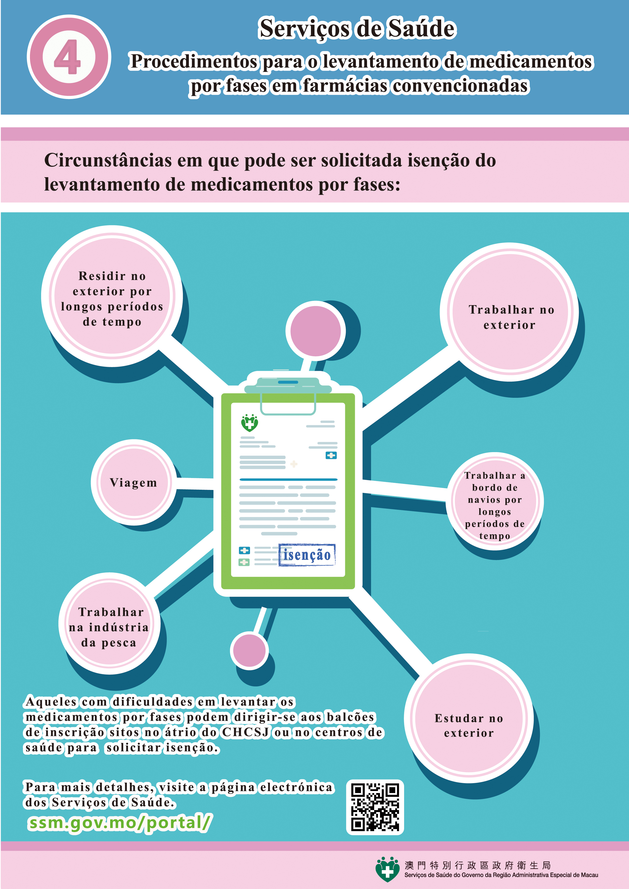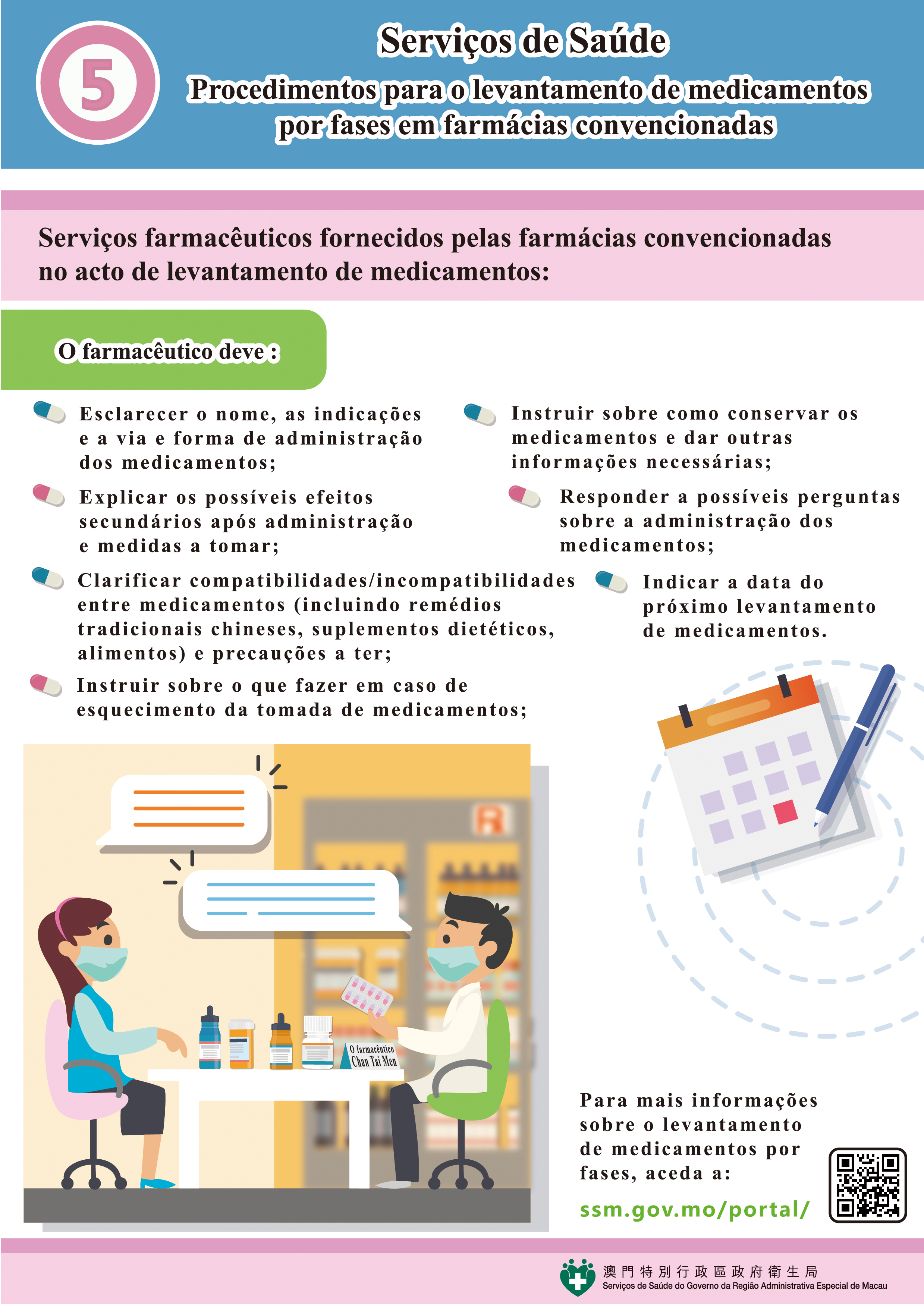 Para mais informações sobre as respectivas medidas, os residentes podem consultar a infografia e o vídeo promocional na página electrónica (https://www.ssm.gov.mo/apps1/StagedMedicineSupply/pt.aspx#nlg25137).