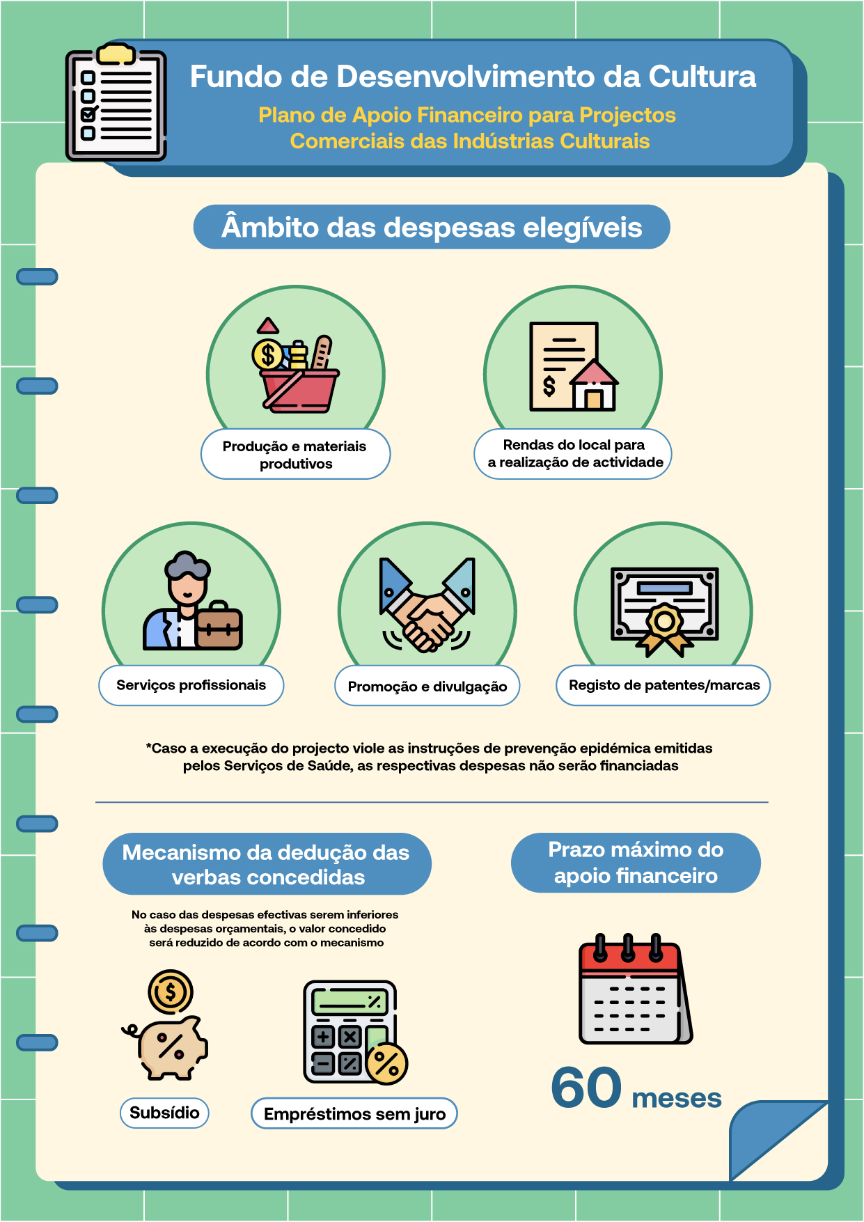 O candidato deve ser empresa comercial, constituída legalmente na RAEM, com mais de 50% do seu capital social detido por residentes da RAEM, ou ser empresário comercial, pessoa singular. Há 4 modalidades de apoio financeiro: empréstimos sem juros, pagamento de juros de empréstimos bancários, subsídio e empréstimos sem juros, pagamento de juros de empréstimos bancários e empréstimos sem juros. As empresas só podem optar por uma das modalidades para o pedido. Caso a empresa esteja no prazo de apoio financeiro, concedido na modalidade de subsídio pelo FDC (antigo Fundo das Indústrias Culturais), e não tenha apresentado o relatório final, ou caso tenha sido financiado sob a modalidade de subsídio por três vezes, só pode pedir a concessão por empréstimos sem juros ou pagamento de juros de empréstimos bancários. No entanto, não será contado o número de concessão no âmbito dos outros planos de apoio financeiro.