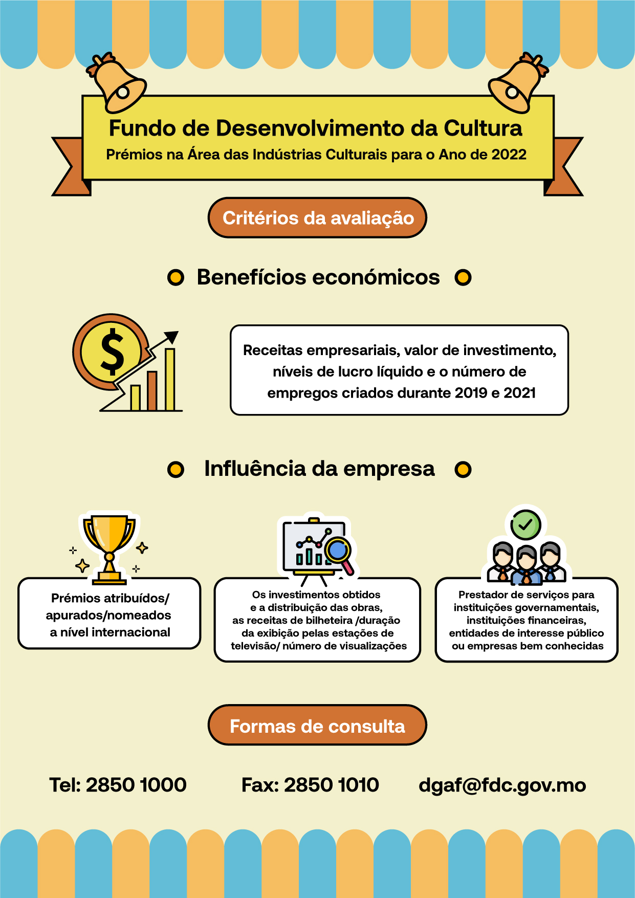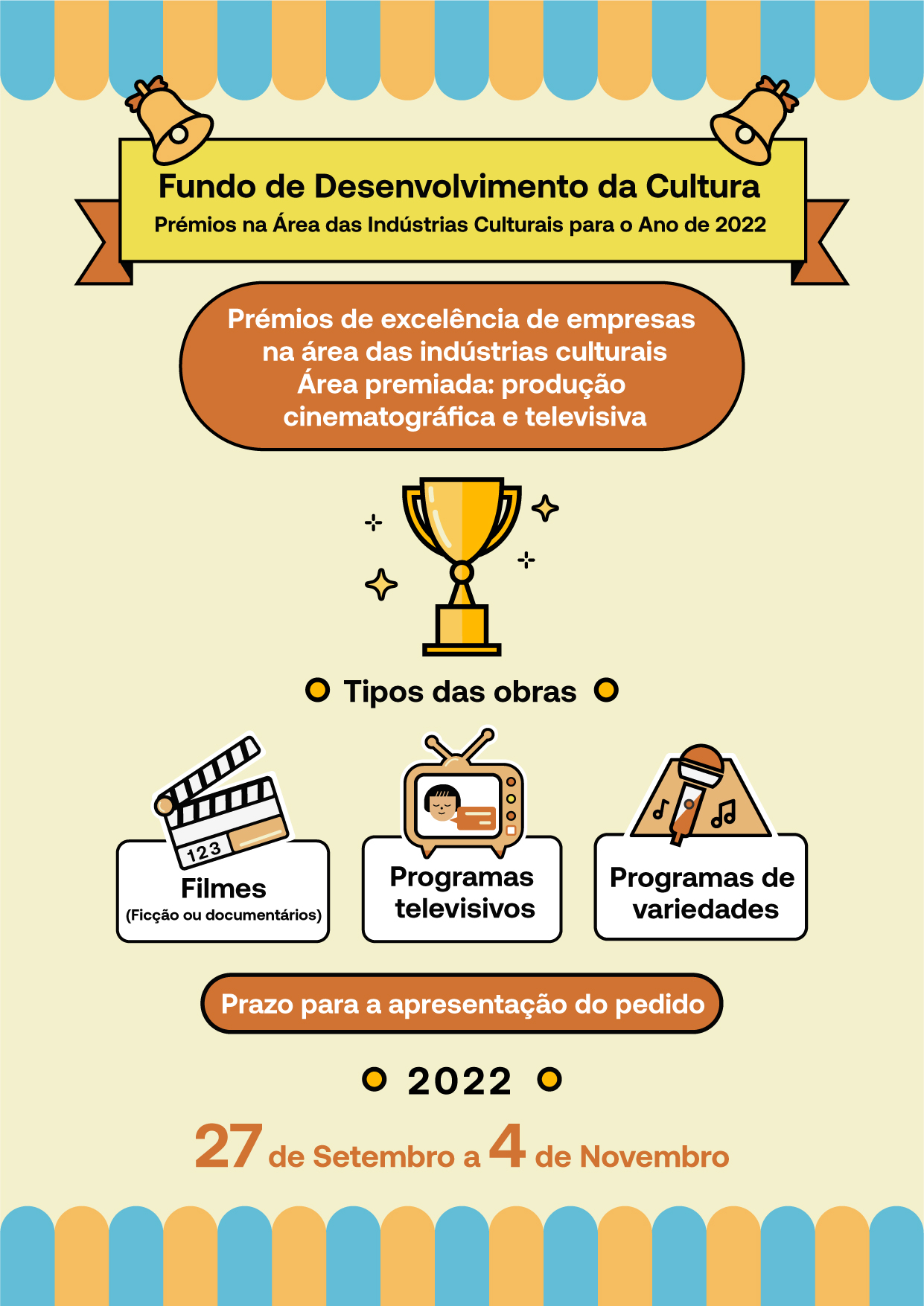 O Fundo de Desenvolvimento da Cultura (FDC) lança os “Prémios na área das indústrias culturais”, criando os “Prémios de excelência de empresas na área das indústrias culturais” - área da produção cinematográfica e televisiva (adiante designado por “Prémios”), de modo a incentivar o sector o desenvolvimento contínuo e a criação de marcas de Macau. Serão aceites os respectivos pedidos entre 27 de Setembro e 4 de Novembro.