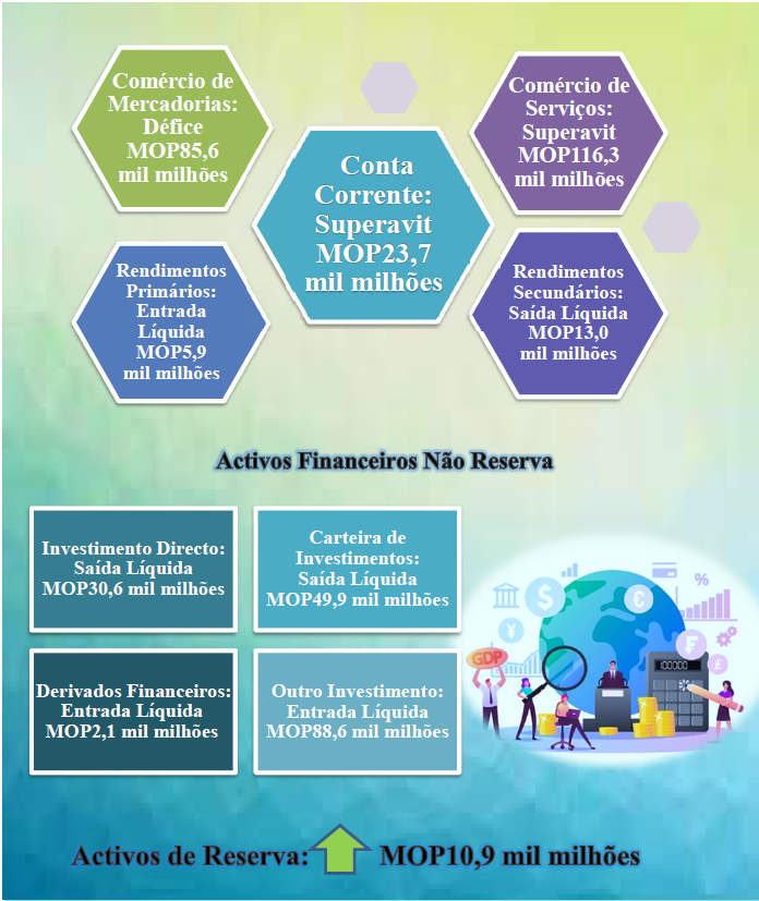 Em 2021 o superavit da conta corrente situou-se em 23,7 mil milhões de Patacas, tendo descido 7,7 mil milhões, face a 31,4 mil milhões registados em 2020, visto que o superavit observado no comércio de serviços e a entrada líquida de rendimento primário compensaram o déficit do comércio de mercadorias e a saída líquida de rendimento secundário.