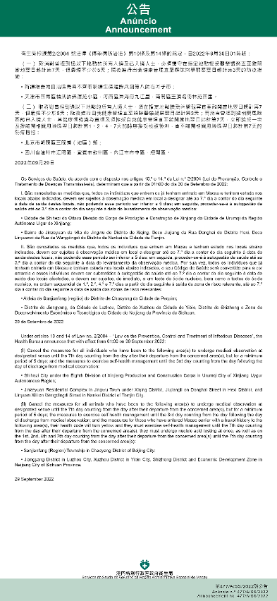 Tendo em consideração a evolução epidemiológica mais actualizada no Interior da China, os Serviços de Saúde, de acordo com o disposto nos artigos 10.º e 14.º da Lei n.º 2/2004 (Lei de Prevenção, Controlo e Tratamento de Doenças Transmissíveis), determinam que a partir da 01h00 do dia 30 de Setembro de 2022, são implementadas ou canceladas as medidas antiepidémicas para quem tenha estado em diversas áreas do Interior da China: