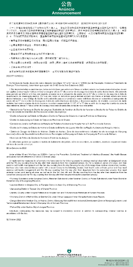 Tendo em consideração a evolução epidemiológica mais actualizada no Interior da China, os Serviços de Saúde, de acordo com o disposto nos artigos 10.º e 14.º da Lei n.º 2/2004 (Lei de Prevenção, Controlo e Tratamento de Doenças Transmissíveis), determinam que a partir da 01h00 do dia 3 de Outubro de 2022, são implementadas ou canceladas as medidas antiepidémicas para quem tenha estado em diversas áreas do Interior da China:
