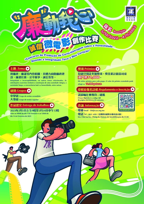 O Comissariado contra a Corrupção (CCAC) organiza o “Concurso de Produção de Curta-metragem sobre a Honestidade – Quando a Integridade Toca o Meu Coração” destinado aos estudantes do ensino superior e do ensino secundário de Macau, com o objectivo de incentivar os jovens a reflectir, durante o processo de criação de curta-metragem, sobre temas relacionados com a honestidade, a partilhar, através de imagens, as suas ideias sobre a honestidade e a integridade, bem como a influenciar e encorajar os seus amigos para contribuir activamente para a construção de uma sociedade íntegra em Macau. As inscrições para o concurso estão abertas a partir de hoje até 4 de Novembro, sendo bem-vindas as inscrições dos estudantes que satisfaçam as condições exigidas, através do scan do código QR da página temática do concurso.