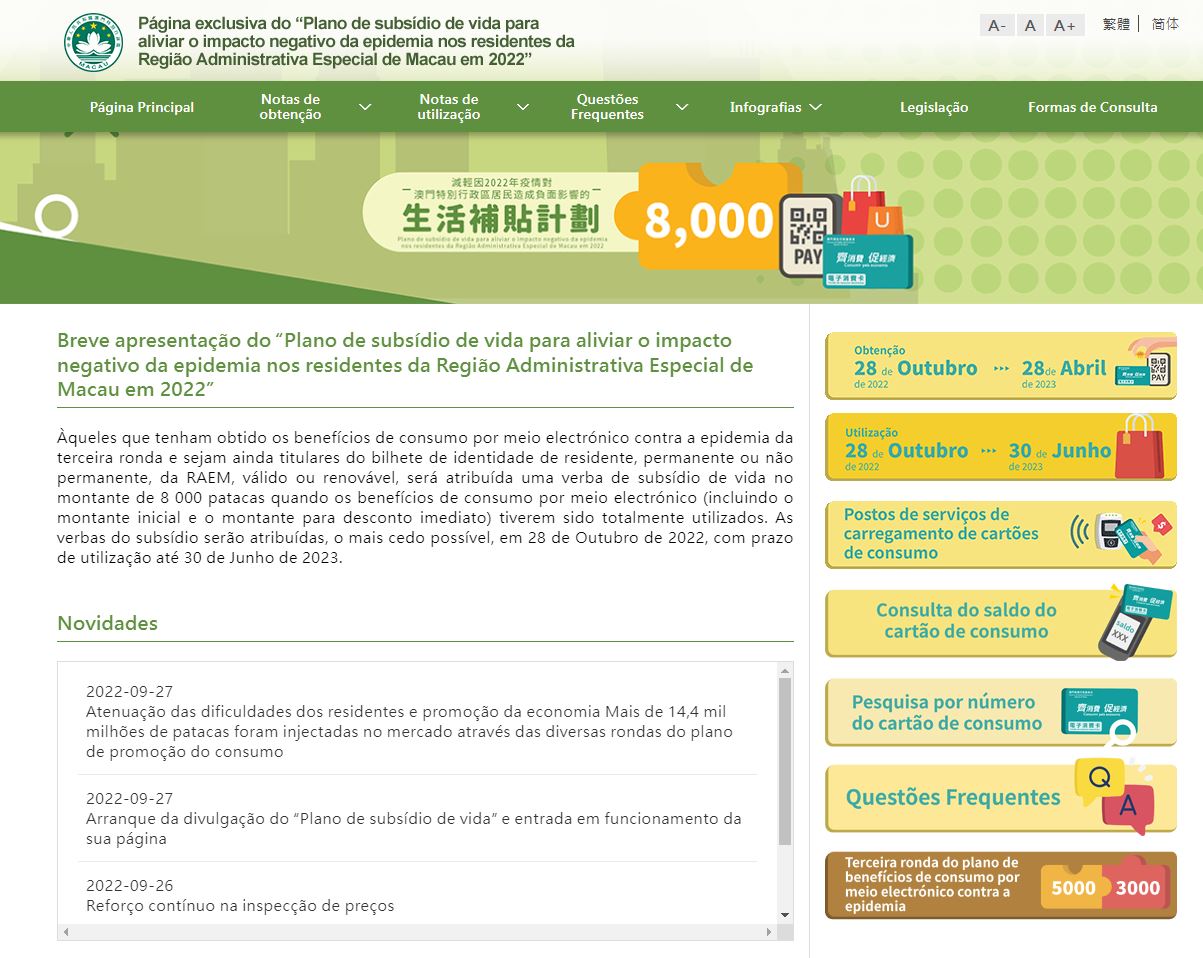 Os residentes qualificados de Macau podem receber e utilizar imediatamente o subsídio de vida no montante de 8.000 patacas o mais cedo em 28 de Outubro de 2022. O âmbito de utilização do subsídio de vida é idêntico ao dos benefícios de consumo por meio electrónico. O limite máximo de utilização diária do subsídio de vida é de 300 patacas, sem fixação do montante para desconto imediato e com prazo de utilização até 30 de Junho de 2023.