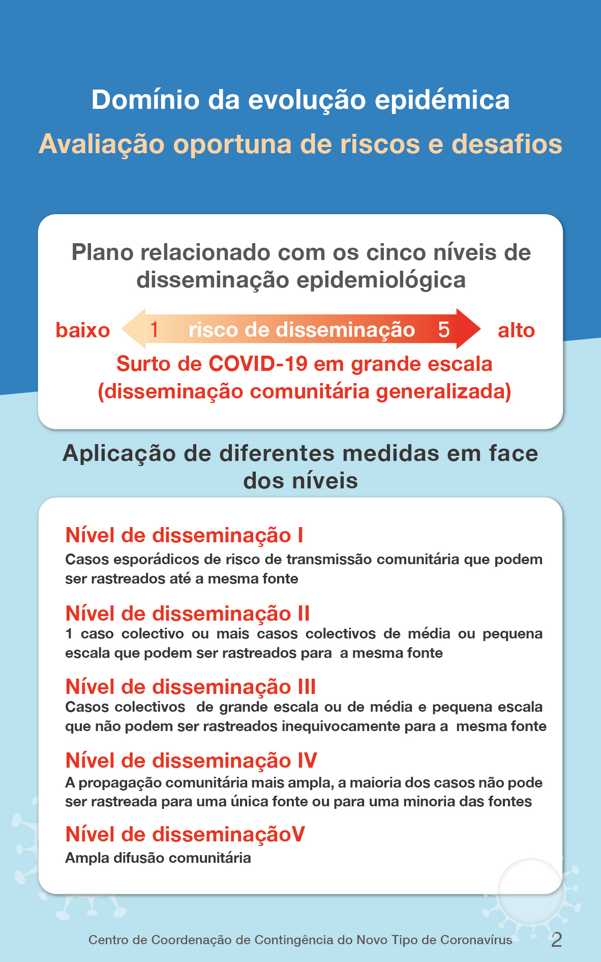 Ao mesmo tempo, após uma análise abrangente das opiniões e sugestões de optimização relevantes, e com referência ao “Plano de Prevenção e Controlo da Pneumonia causada pelo novo tipo de Coronavírus (9.ª versão)” divulgado pelo Mecanismo conjunto de prevenção e controlo do Conselho de Estado, revendo plenamente o “Plano de Resposta de Emergência para a situação epidémica da COVID-19 em grande escala (1ª. versão), (adiante designado por Plano da 1.a versão), o Governo da RAEM concluiu a revisão e elaboração do “Plano de Contingência em resposta à Epidemia de Pneumonia causada pelo novo tipo de coronavírus (2.ª versão)” (doravante designado por “Plano de contingência, 2.ª versão”).