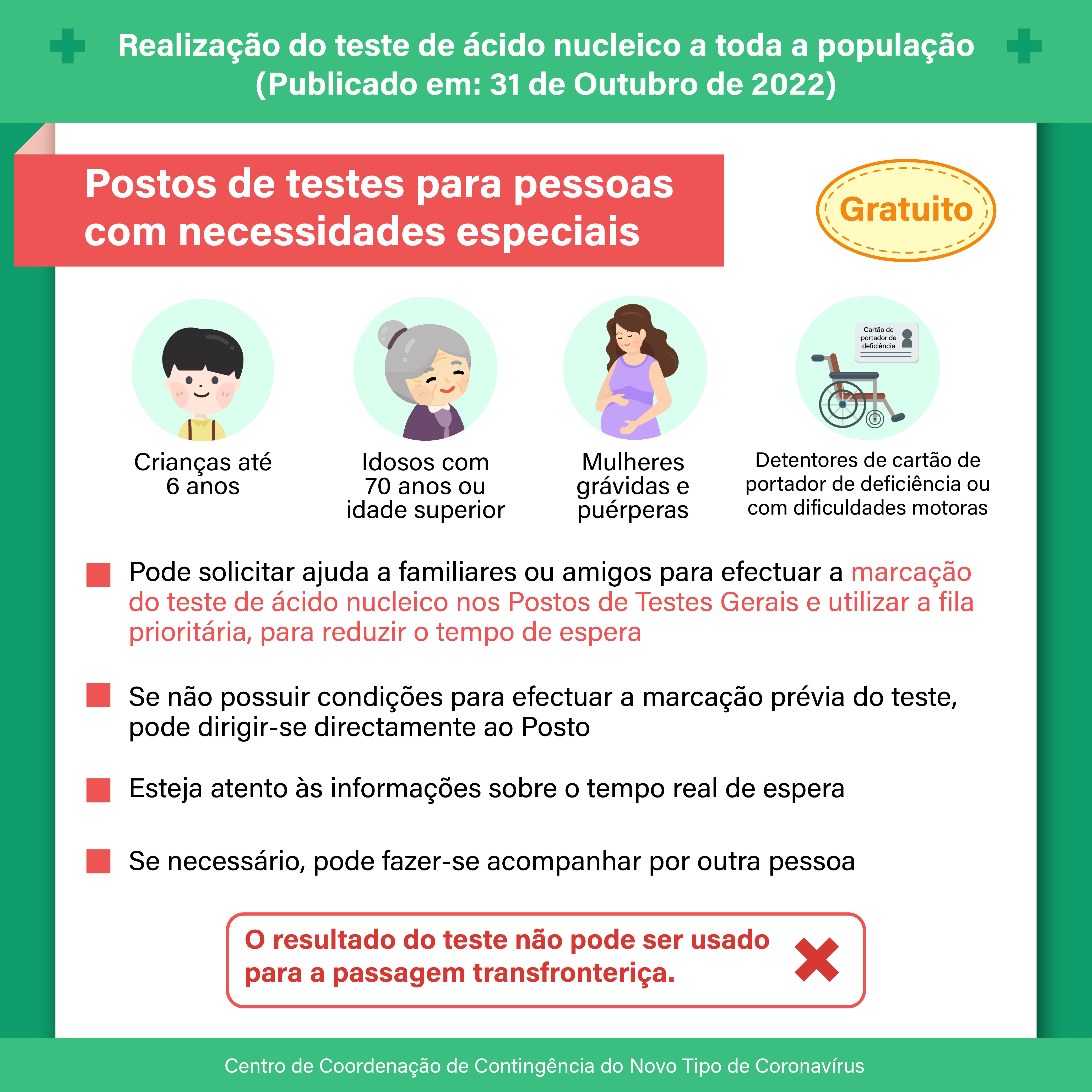 - Dispõem postos de testes destinados às pessoas com necessidades especiais, postos de testes gerais (com marcação obrigatória), postos de testes pagos (com marcação obrigatória).