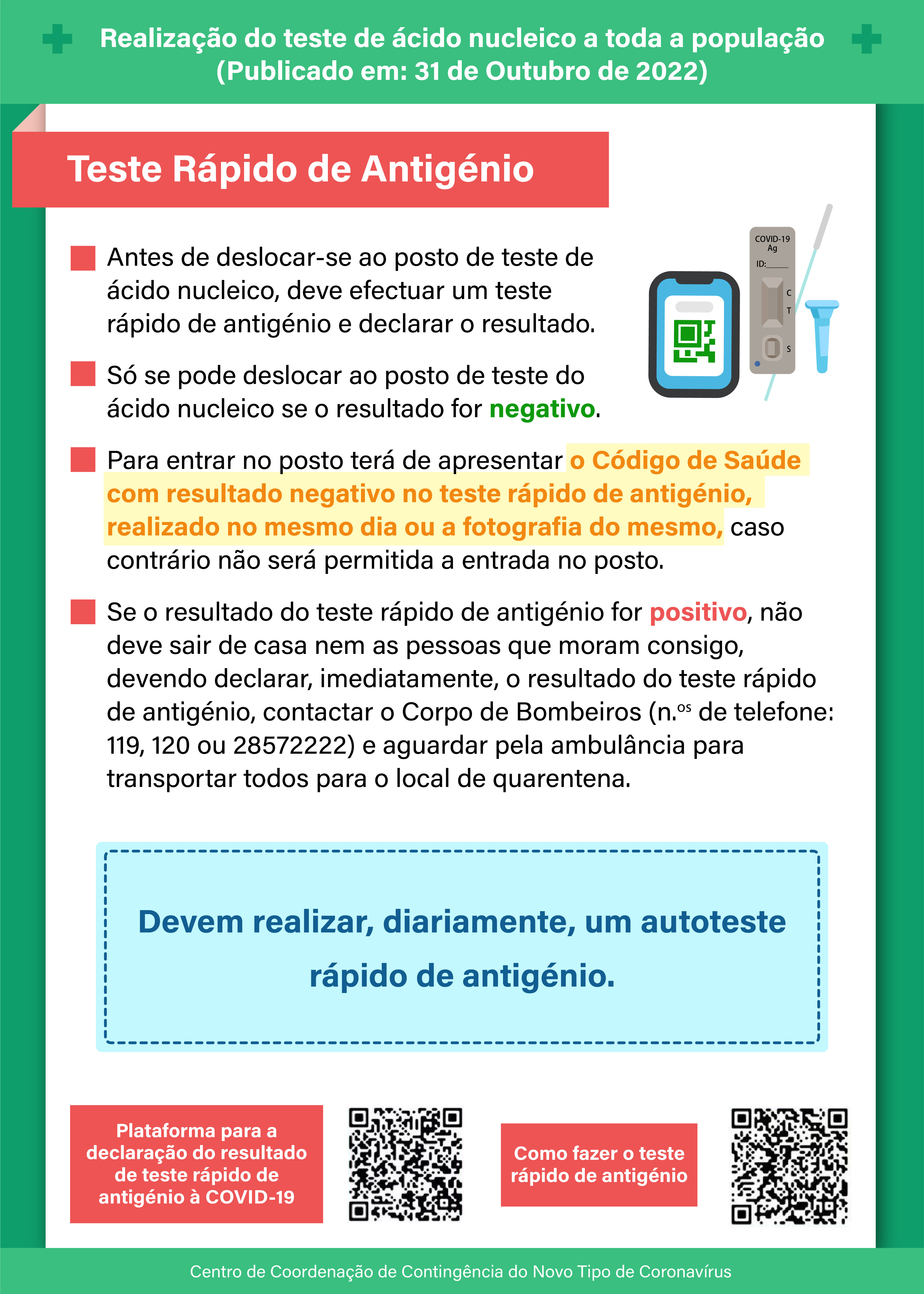 - Os residentes antes de se deslocarem aos postos de testagem massiva devem realizar o auto-teste rápido de antigénio. Caso o resultado do teste seja negativo, devem exibir o Código de Saude de Macau, com resultado negativo do auto-teste rápido de antigénio ou, uma foto mostrando um resultado negativo do auto-teste rápido de antigénio, na entrada do posto de teste de ácido nucleico; caso contrário não podem entrar no local de realização do teste.