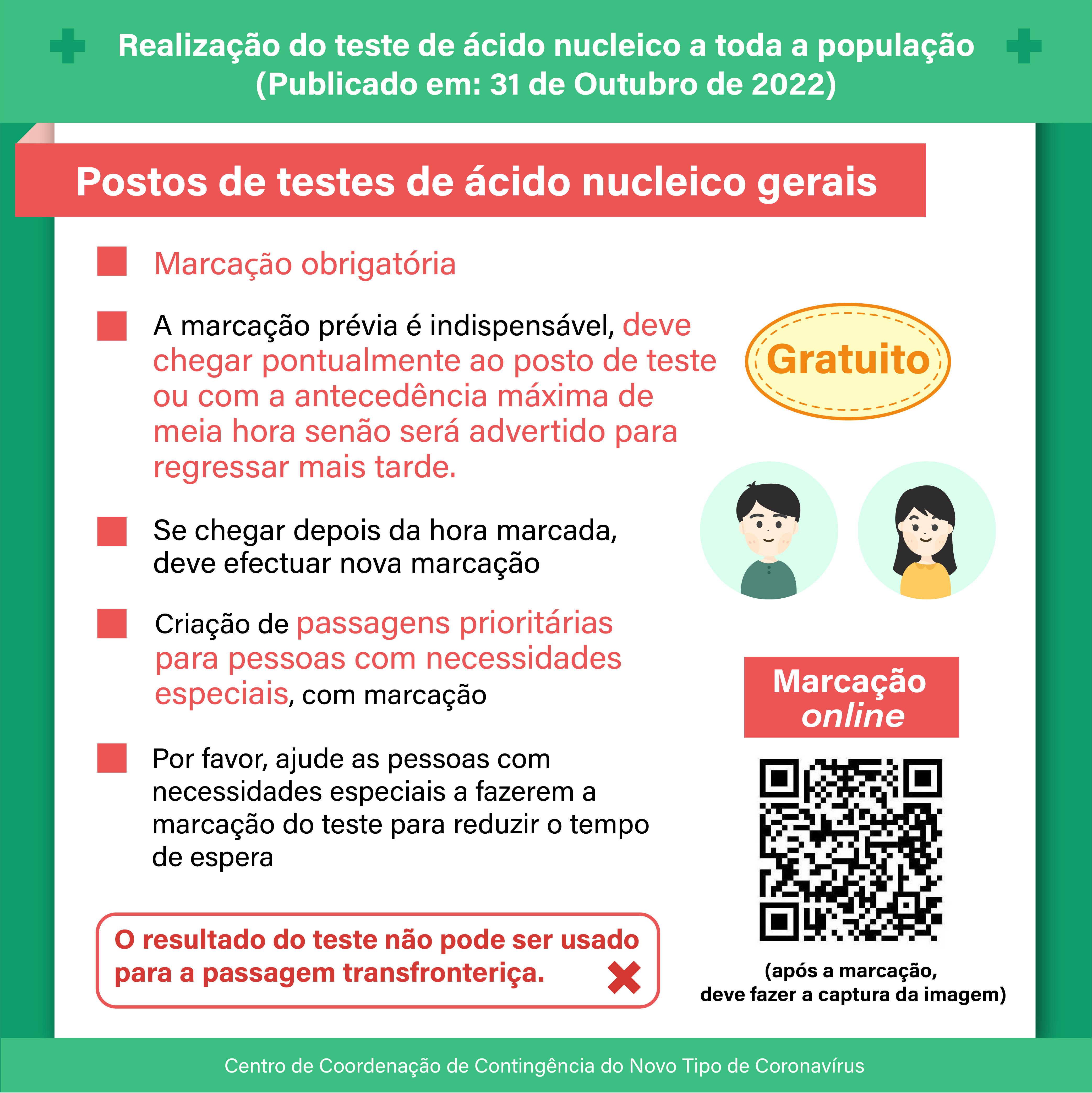 - O sistema de marcação está disponível a partir das 21: 00 horas do dia 31 de Outubro, pela página electrónica de marcação gratuita (o resultado do teste não se aplica a passagem fronteiriça) https://eservice.ssm.gov.mo/allpeoplernatestbook;