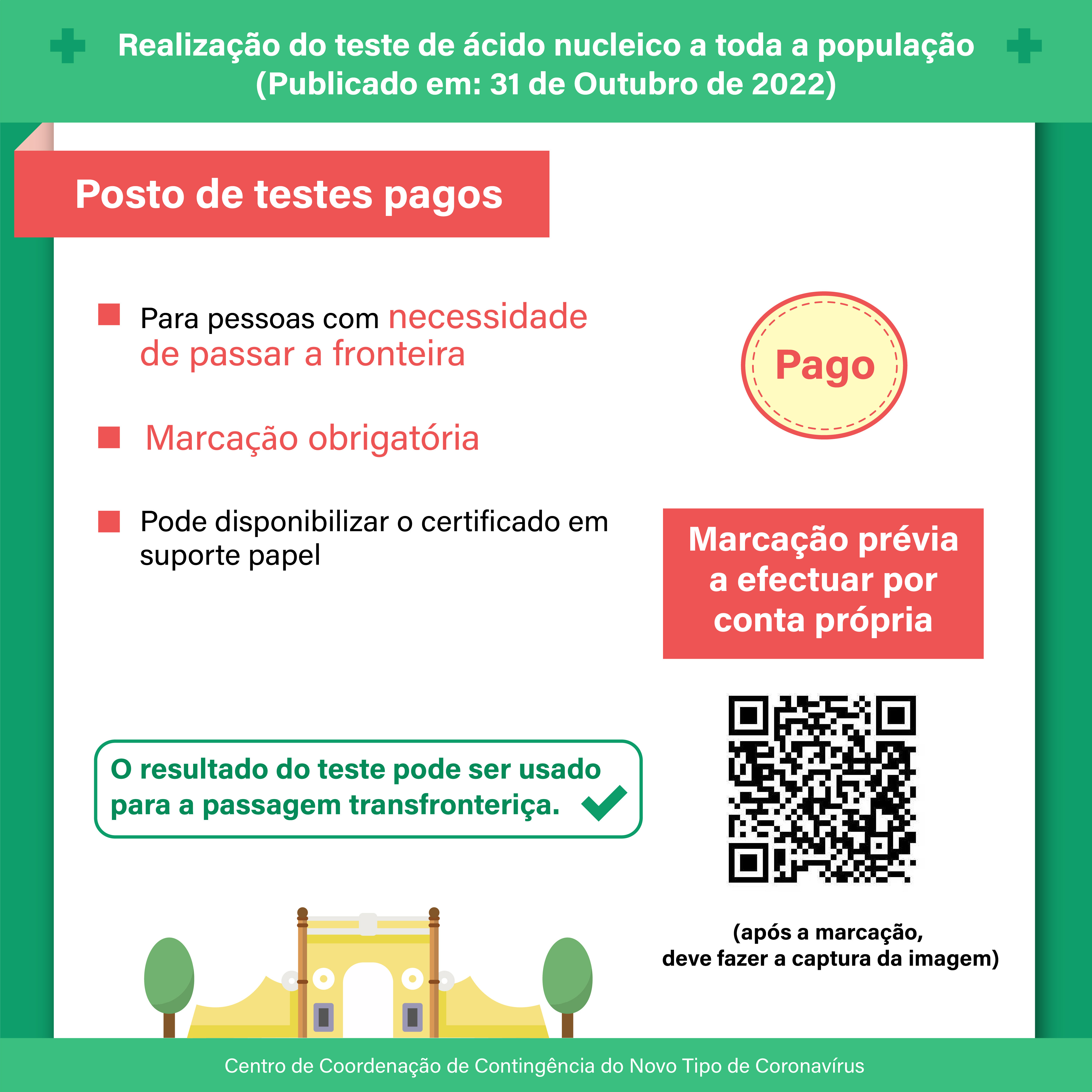 - A página electrónica para marcação de testes de ácido nucleico pagos: https://eservice.ssm.gov.mo/rnatestbook É disponibilizado certificado de teste em suporte de papel e o resultado, pode ser carregado no Código de Saúde, serve para a passagem fronteiriça e ainda pode ser considerado, como resultado do teste massivo de ácido nucleico.