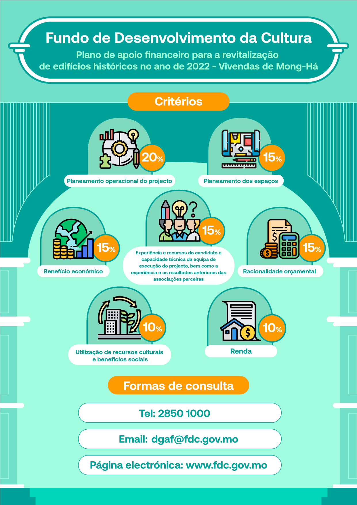 Para mais informações sobre os pedidos para o Plano, o FDC realizará uma sessão de esclarecimento online às 15h00 do dia 7 de Novembro, a fim de responder às perguntas dos candidatos. Os interessados podem inscrever-se ao FDC, até às 11h00 do dia 7 de Novembro, através do n.º de telefone, 2850 1000 ou por email, dgaf@fdc.gov.mo. A ligação da transmissão ao vivo será fornecida posteriormente aos participantes para entrarem no respectivo canal.