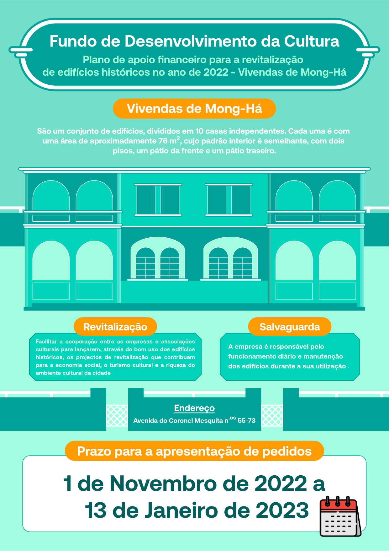 O prazo para a apresentação de pedido a este Plano é de 1 de Novembro de 2022 a 13 de Janeiro de 2023. Neste Plano, o FDC arrendará ao beneficiário os 10 edifícios das Vivendas de Mong-Há, situadas na Avenida do Coronel Mesquita, e prestará apoio financeiro para as despesas de renovação e aquisição antes da abertura ao público e de promoção e divulgação durante o prazo de apoio financeiro.