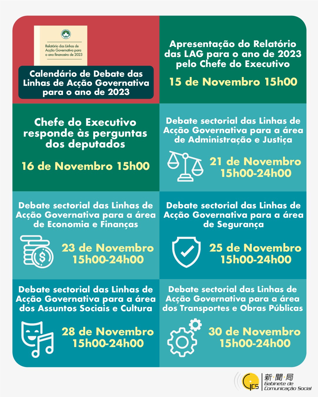 O Chefe do Executivo, Ho Iat Seng, apresenta, no dia 15 de Novembro, pelas 15h00, o «Relatório das Linhas de Acção Governativa para o ano financeiro de 2023», na Assembleia Legislativa, seguindo-se a conferência de imprensa, pelas 17h00, na Sede do Governo, durante a qual responderá às questões da comunicação social. No dia seguinte, 16 de Novembro, às 15h00, o Chefe do Executivo vai ao plenário da Assembleia Legislativa para responder às perguntas dos deputados sobre o referido relatório.