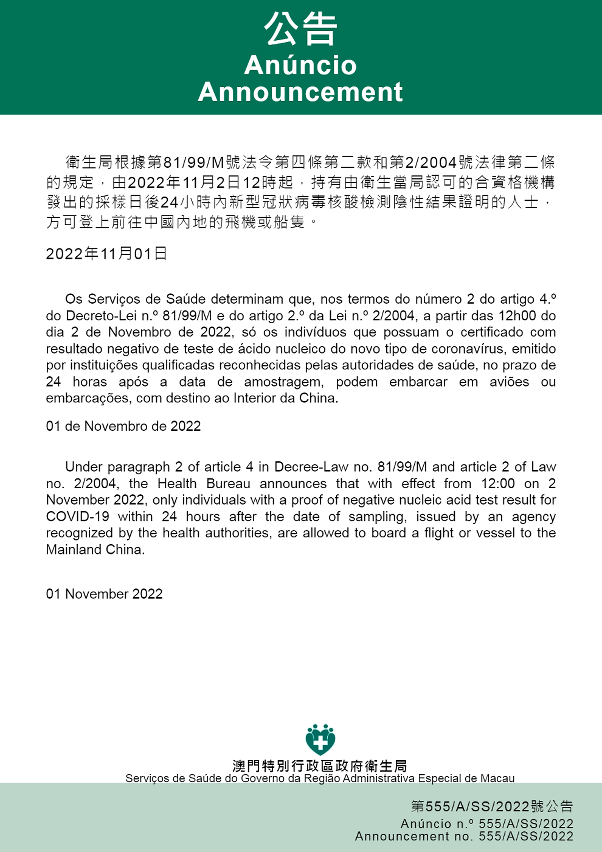 A partir das 12h00 do dia 2 de Novembro de 2022, só os indivíduos que possuam o certificado com resultado negativo de teste de ácido nucleico do novo tipo de coronavírus, no prazo de 24 horas após a data de amostragem, podem embarcar em aviões ou embarcações, com destino ao Interior da China. O referido certificado deve ser emitido por instituições qualificadas reconhecidas pelas autoridades de saúde.