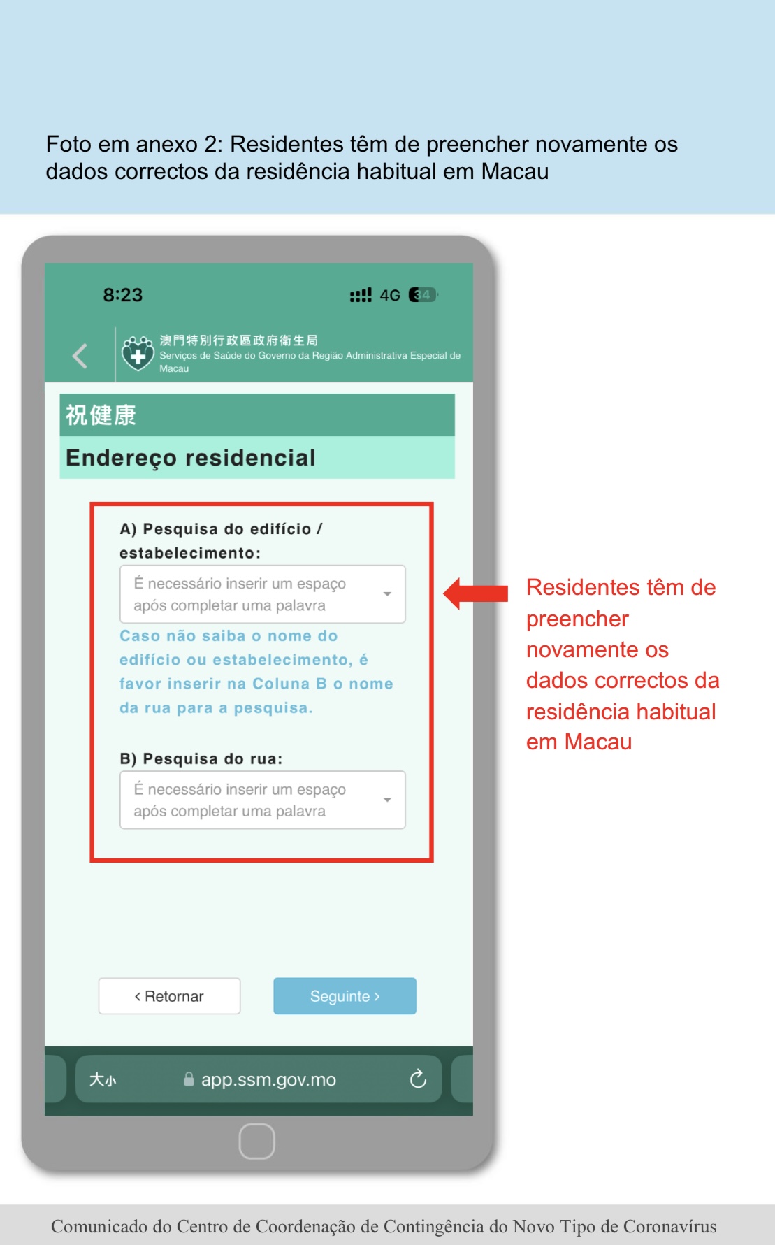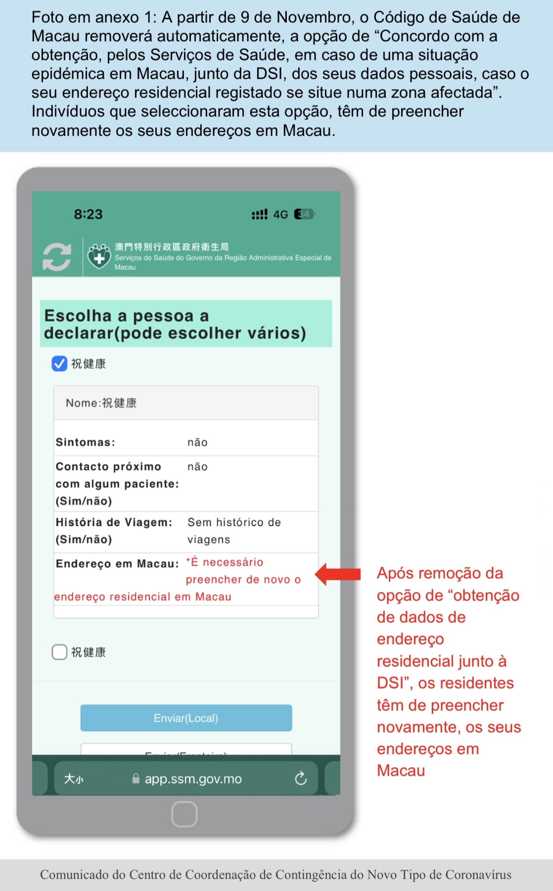 O Centro de Coordenação de Contingência do Novo Tipo de Coronavírus informou que, no preenchimento de endereço em Macau no “Código de Saúde de Macau”, alguns residentes seleccionaram a opção “Concordo com a obtenção, pelos Serviços de Saúde, em caso de uma situação epidémica em Macau, junto da DSI, dos seus dados pessoais, caso o seu endereço residencial registado se situe numa zona afectada” mas, não efectuaram a actualização das informações de endereço na Direcção dos Serviços de Identificação, previamente, fazendo com que o código fosse convertido na cor vermelha ou amarela, por terem inserido dados errados de endereço, durante o período de controlo selado de prevenção de epidemia. A fim de evitar a situação supra, que causa incómodos aos cidadãos, a partir da próxima Quarta-feira (9 de Novembro), a opção “Concordo com a obtenção, pelos Serviços de Saúde, em caso de uma situação epidémica em Macau, junto da DSI, dos seus dados pessoais, caso o seu endereço residencial registado se situe numa zona afectada”, no Código de Saúde de Macau será removida e, nessa altura os cidadãos têm de actualizar propriamente e preencher correctamente, os dados de endereço habitual de Macau, para ser disponibilizado o código de saúde de Macau.