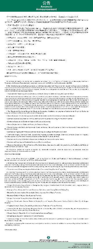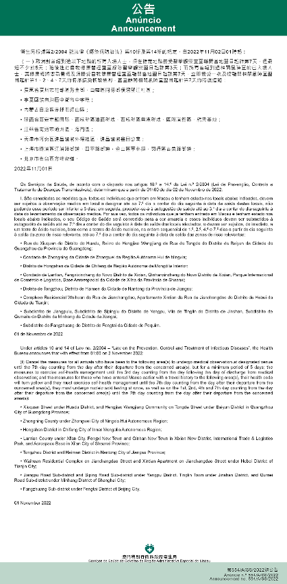 Tendo em consideração a evolução epidemiológica mais actualizada no Interior da China, os Serviços de Saúde, de acordo com o disposto nos artigos 10.º e 14.º da Lei n.º 2/2004 (Lei de Prevenção, Controlo e Tratamento de Doenças Transmissíveis), determinam que a partir da 01h00 do dia 02 de Novembro de 2022, são implementadas ou canceladas as medidas antiepidémicas para quem tenha estado em diversas áreas do Interior da China: