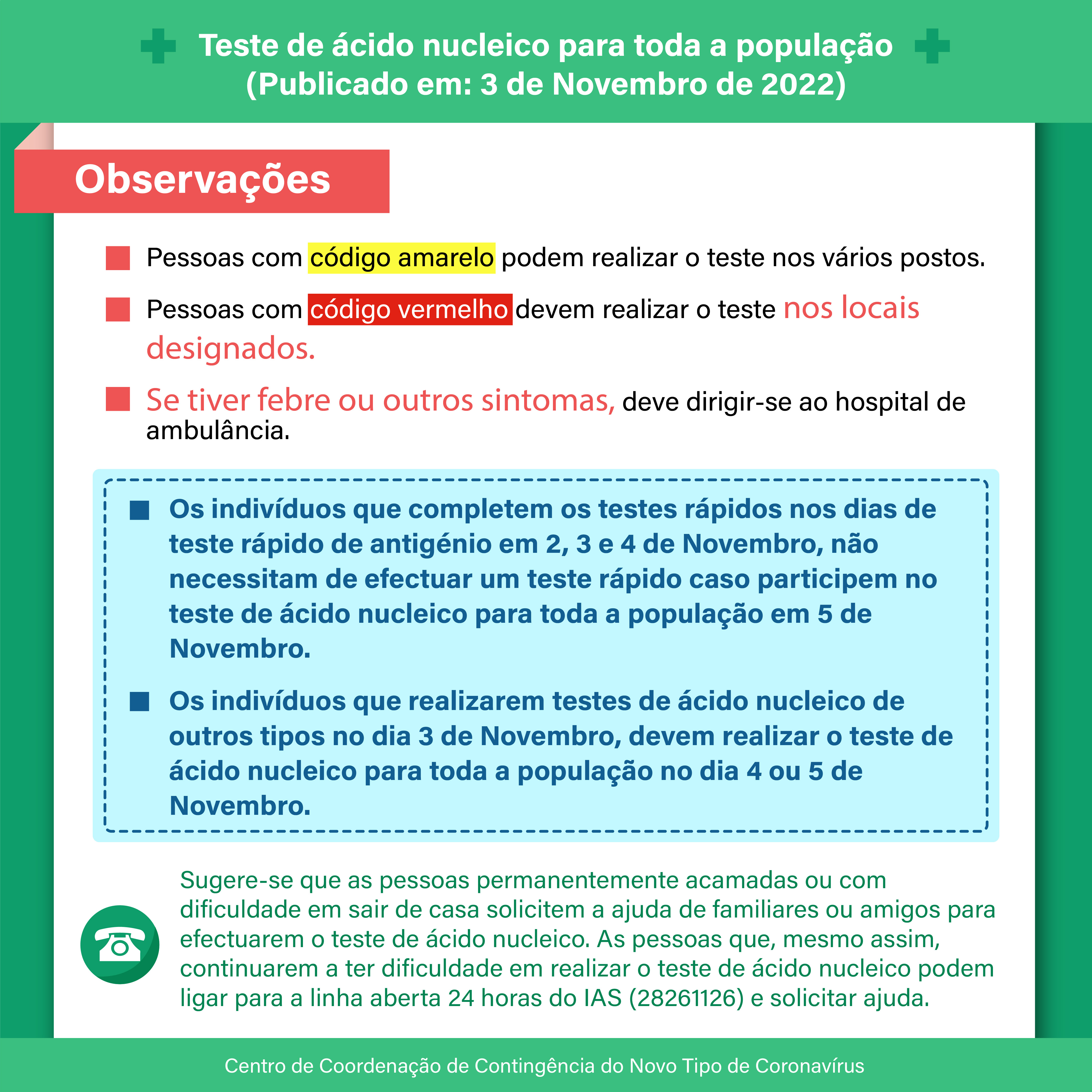 - Caso tenha participado em outros tipos de testes de ácido nucleico, no dia 3 de Novembro, ainda deve participar na 2.ª ronda de teste massivo de ácido nucleico, nos dias 4 ou 5 de Novembro.