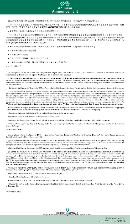 Tendo em consideração a evolução epidemiológica mais actualizada no Interior da China, os Serviços de Saúde, de acordo com o disposto nos artigos 10.º e 14.º da Lei n.º 2/2004 (Lei de Prevenção, Controlo e Tratamento de Doenças Transmissíveis), determinam que a partir da 01h00 do dia 04 de Novembro de 2022, são implementadas ou canceladas as medidas antiepidémicas para quem tenha estado em diversas áreas do Interior da China: