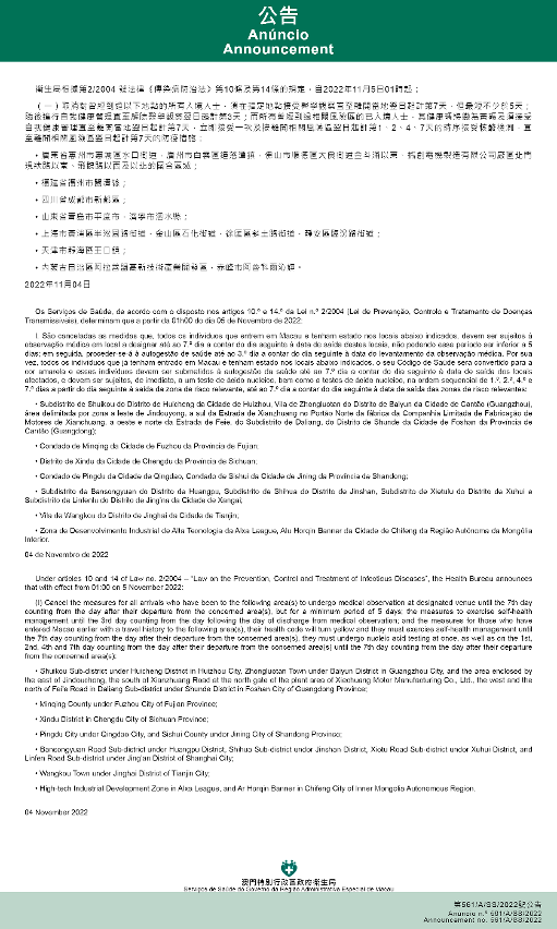 Tendo em consideração a evolução epidemiológica mais actualizada no Interior da China, os Serviços de Saúde, de acordo com o disposto nos artigos 10.º e 14.º da Lei n.º 2/2004 (Lei de Prevenção, Controlo e Tratamento de Doenças Transmissíveis), determinam que a partir da 01h00 do dia 05 de Novembro de 2022, são implementadas ou canceladas as medidas antiepidémicas para quem tenha estado em diversas áreas do Interior da China: