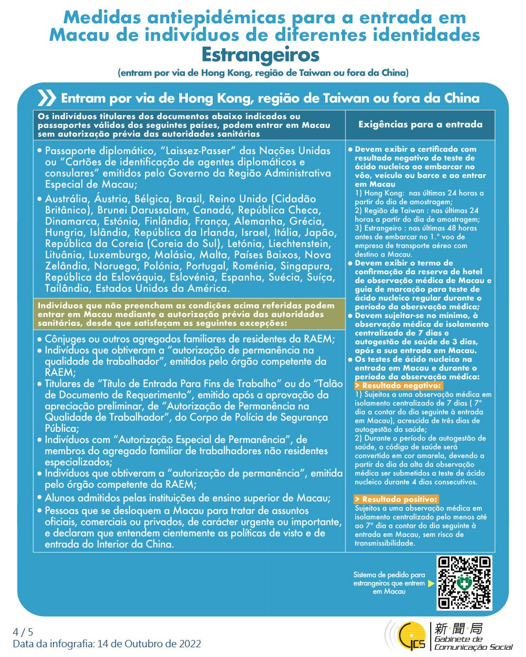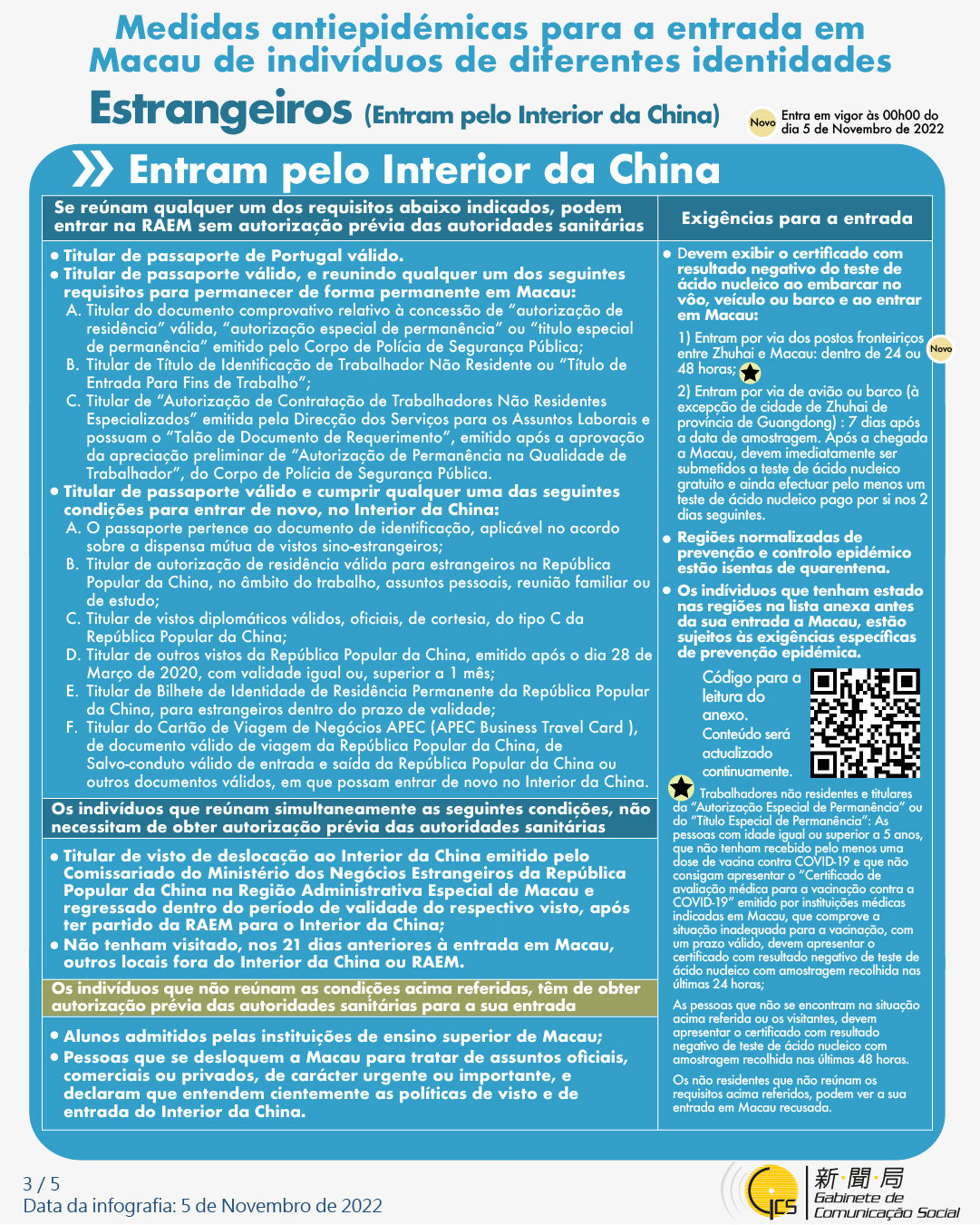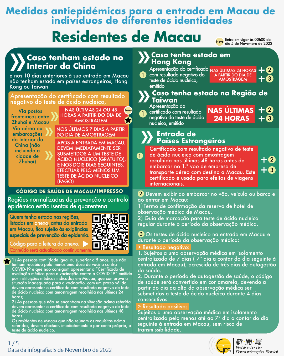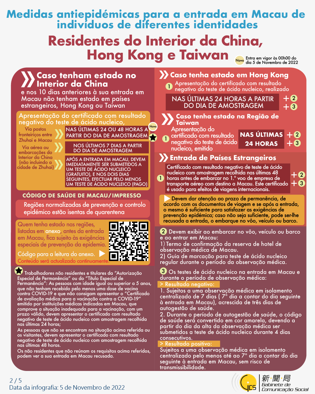 (Infografia) Medidas antiepidémicas para a entrada em Macau de indivíduos de diferentes identidades, actualizadas no dia 5 de Novembro de 2022