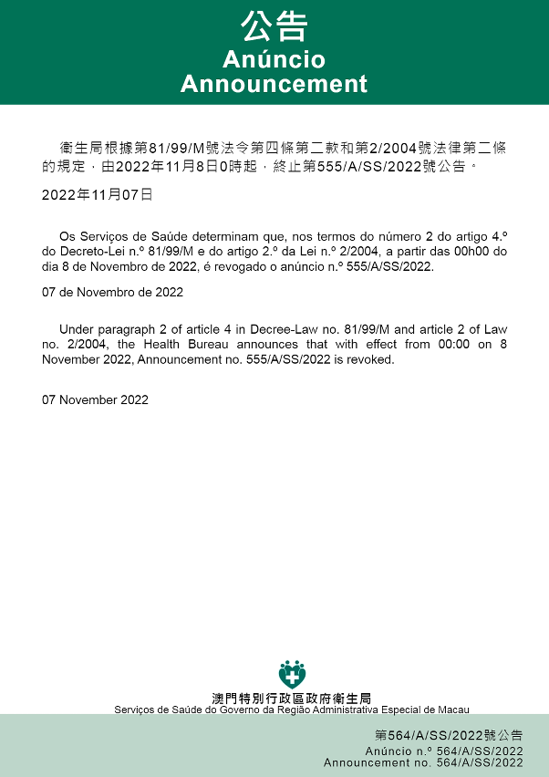 O Centro de Coordenação de Contingência do Novo Tipo de Coronavírus informa que, os Serviços de Saúde determinaram que, nos termos do disposto no n.º 2 do artigo 4.º do Decreto-Lei n.º 81/99/M, bem como no artigo 2.º da Lei n.º 2/2004, a partir das 00h00, de 8 de Novembro de 2022, foi revogado o anúncio n.º 555/A/SS/2022.