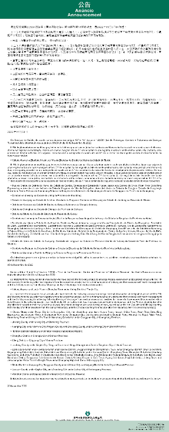 Tendo em consideração a evolução epidemiológica mais actualizada no Interior da China, os Serviços de Saúde, de acordo com o disposto nos artigos 10.º e 14.º da Lei n.º 2/2004 (Lei de Prevenção, Controlo e Tratamento de Doenças Transmissíveis), determinam que a partir da 01h00 do dia 09 de Novembro de 2022, são implementadas ou canceladas as medidas antiepidémicas para quem tenha estado em diversas áreas do Interior da China: