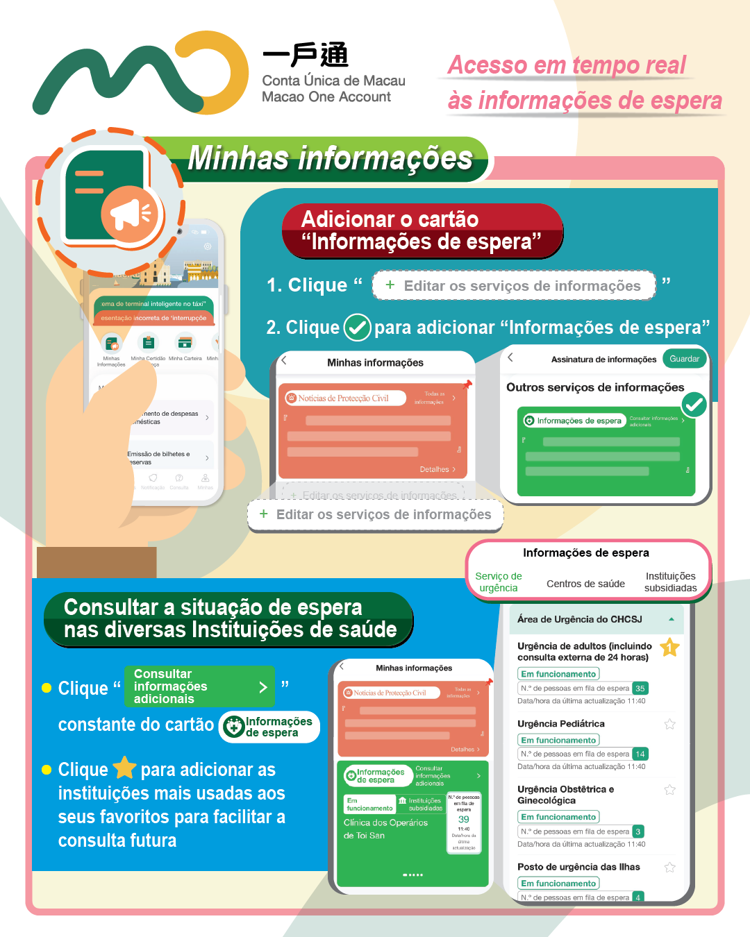 Com vista a facilitar o acesso dos cidadãos aos serviços de assistência médica, a partir de hoje, será adicionado o serviço personalizado de “Informações sobre listas de espera” à funcionalidade “Minhas informações” da Conta Única de Macau, para que os cidadãos o possam utilizar em função das suas necessidades. Este serviço disponibilizará, em tempo real, as informações sobre a situação de espera dos serviços de urgência do CHCSJ e do Hospital Kiang Wu, assim como as listas de espera das consultas sem pré-marcação nos centros de saúde e das consultas externas nas entidades subsidiadas, nomeadamente as clínicas dos Operários da União das Associações de Operários de Macau, as clínicas da Associação Geral dos Chineses Ultramarinos, os centros médicos de povo da Aliança de Povo de Instituição de Macau e centro médico Son Vo da Associação de Nova Juventude Chinesa de Macau. Além disso, será possível consultar o número de pessoas à espera na instituição em causa, aceder às informações como o endereço e a hora de abertura de consultas médicas, e atendendo aos hábitos pessoais, poder-se-á seleccionar o sinalizador “Estrela” para guardar as instituições pesquisadas frequentemente em “Informações sobre listas de espera”, de modo a facilitar futuras pesquisas. A nova funcionalidade somente pode ser utilizada com a actualização para a última versão da aplicação para telemóvel “Conta Única de Macau”.