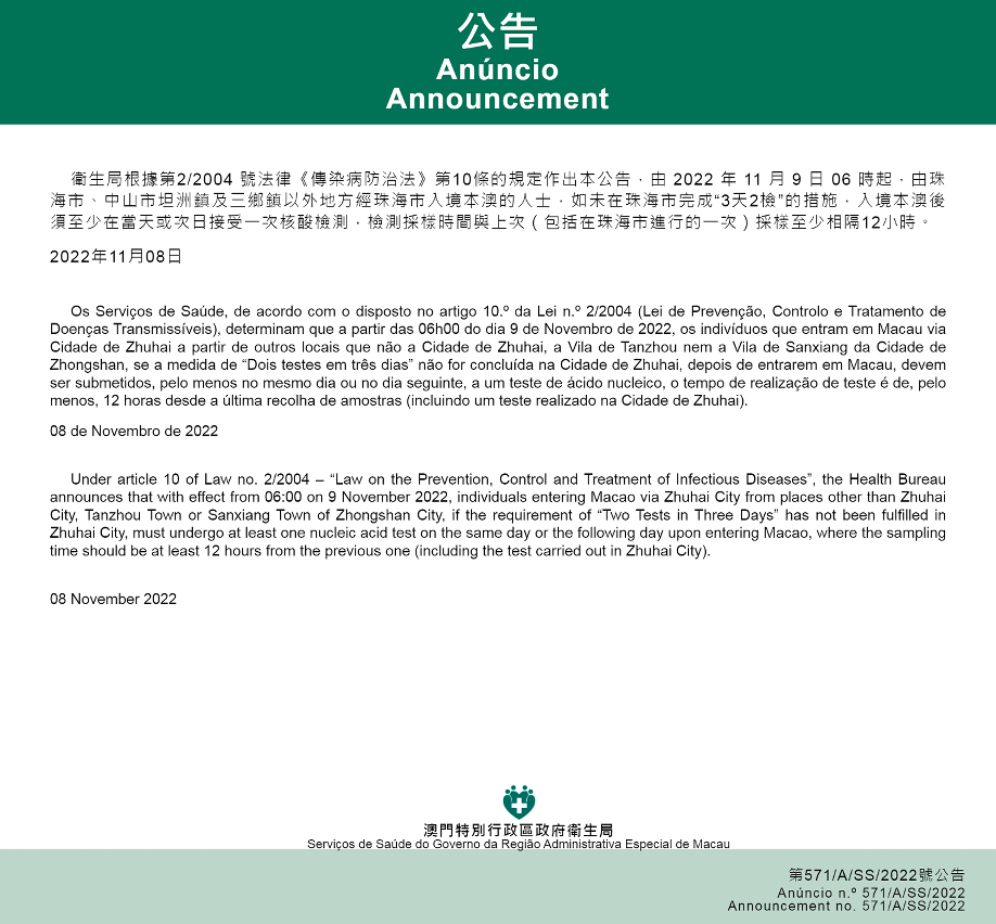O Centro de Coordenação de Contingência do Novo Tipo de Coronavírus (adiante designado por Centro de Coordenação de Contingência) informou que, em resposta à situação epidemiológica nos diversos locais do Interior da China, em articulação com a implementação da medida da Cidade de Zhuhai sobre “Dois testes em três dias” para individuos provenientes fora de Zhuhai e desloquem a Zhuhai, a partir das 6h00 de amanhã (dia 9), os indivíduos que entram em Macau via Zhuhai a partir de outros locais que não a Cidade de Zhuhai, a Vila de Tanzhou nem a Vila de Sanxiang da Cidade de Zhongshan, se a medida de “Dois testes em três dias” não for concluída em Zhuhai, depois de entrar em Macau, deve ser submetido, pelo menos no mesmo dia ou no dia seguinte, a um teste de ácido nucleico, o tempo de realização de teste é de, pelo menos, 12 horas desde a última recolha de amostras (incluindo um teste realizado em Zhuhai).