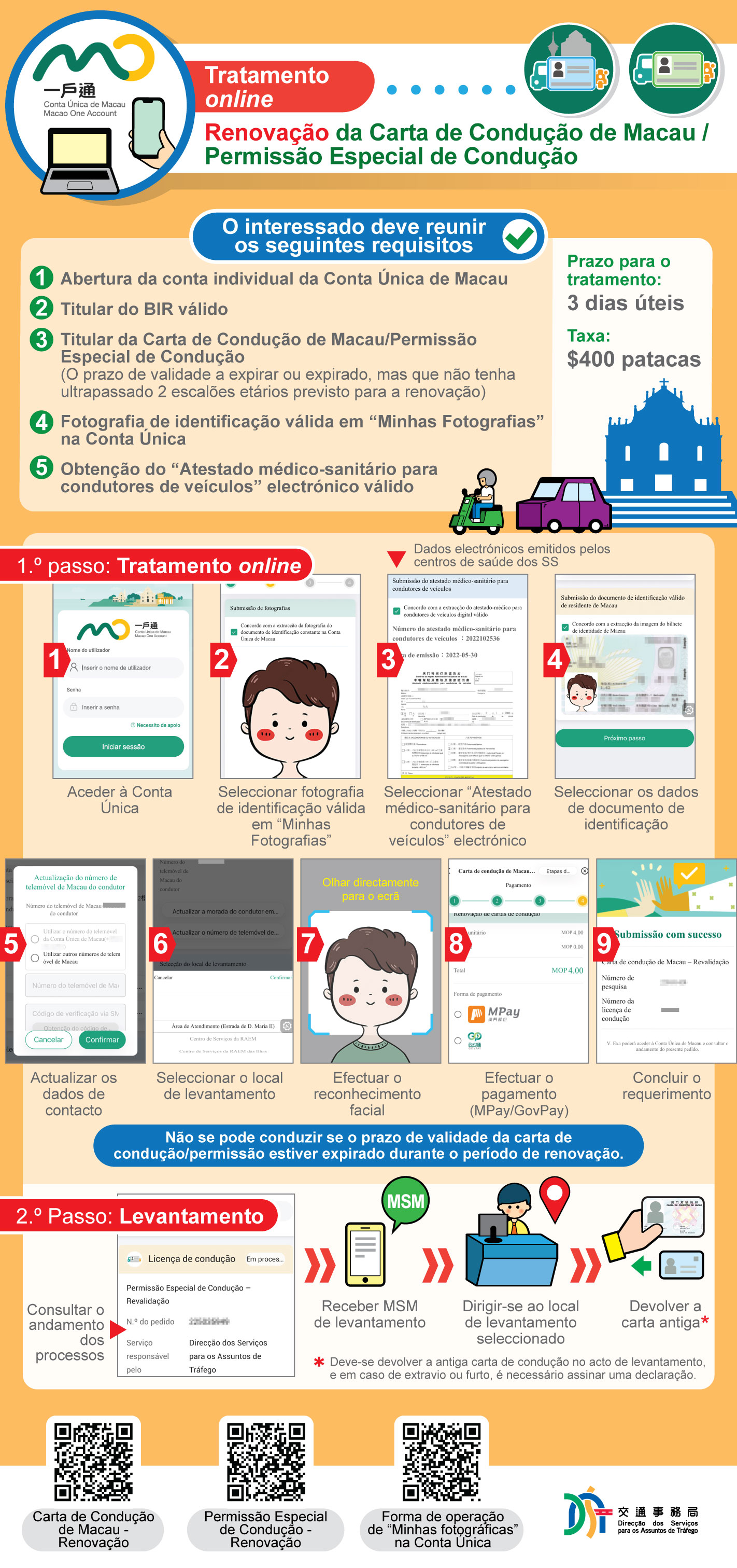 Depois de concluir o requerimento on-line, o interessado pode levantar o seu documento físico no prazo máximo de três dias úteis, ou seguindo o aviso de progresso apresentado em “Meus assuntos da Conta Única, no local de levantamento à sua escolha no momento do requerimento. Em relação à renovação da carta de condução, o interessado deve entregar a antiga carta de condução no acto de levantamento, e em caso de extravio ou furto, é necessário assinar uma declaração. A DSAT lembra que o interessado deve levantar o seu documento físico o mais cedo possível para que este possa ser verificado quando a carta de condução electrónica não puder ser produzida através da Conta Única. Não se pode conduzir se o prazo de validade da carta de condução/permissão estiver expirado durante o período de renovação.