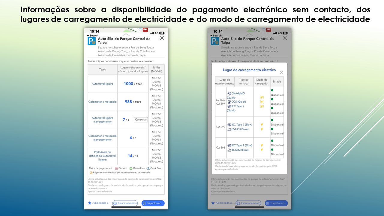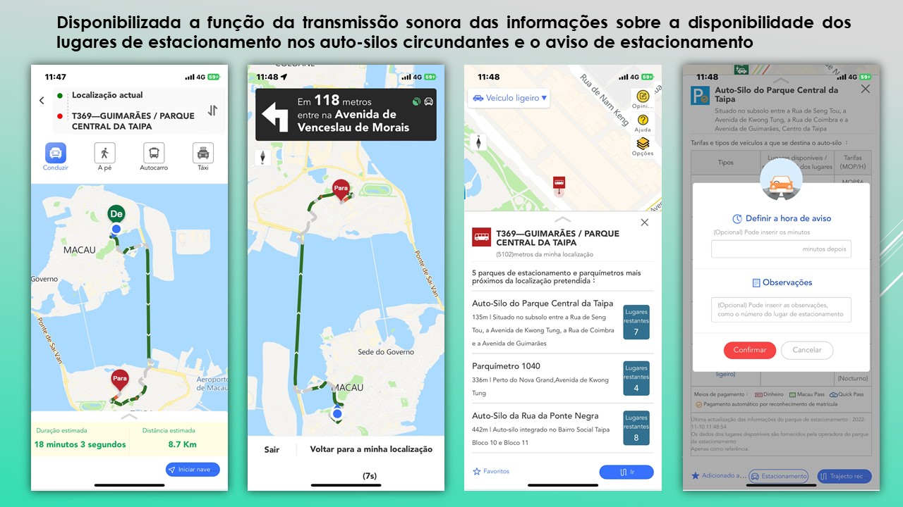 Os utilizadores, ao clicarem as coordenadas no mapa fazendo o zoom, poderão obter as informações sobre os transportes públicos envolventes (paragens dos autocarros, praças dos táxis e estações do metro ligeiro) e os parques de estacionamento público (disponibilidade dos lugares para veículos electrícos e auto-silos com o pagamento electrónico sem contacto). Podem ainda, conforme as suas próprias necessidades, escolher os diferentes meios ou itinerários sugeridos de deslocação. Para os utentes que utilizam o modo de condução, podem ser orientados pela transmissão sonora das informações para saber a disponibilidade dos lugares de estacionamento nos auto-silos circundantes e parquímetros, de modo a prever o tempo e a distância de deslocação.