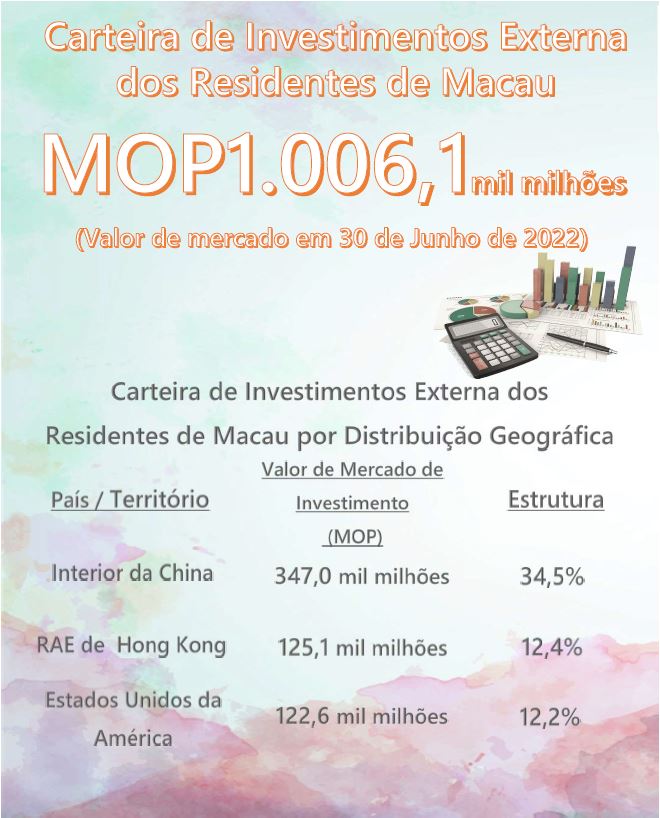 Nas estatísticas divulgadas pela Autoridade Monetária de Macau (AMCM) constata-se que os investimentos dos residentes de Macau - incluindo indivíduos, governo e outras pessoas colectivas, mas excluindo as reservas cambiais da Região Administrativa Especial de Macau - em títulos emitidos por entidades não residentes independentes, calculados a preços de mercado em 30 de Junho de 2022, registaram um valor de 1.006,1 mil milhões de patacas, ou seja, -8,4% face a 31 de Dezembro de 2021 e -6,6% face ao período homólogo de 2021. Entre os vários componentes da carteira, os investimentos em títulos representativos de capital (incluindo fundos mútuos e investimentos em trusts), obrigações a longo prazo e obrigações a curto prazo atingiram 331,9 mil milhões, 623,6 mil milhões e 50,6 mil milhões de patacas, respectivamente, em valor de mercado, traduzindo quedas respectivas de 14,7%, 3,7% e 17,8% em relação ao final de 2021.