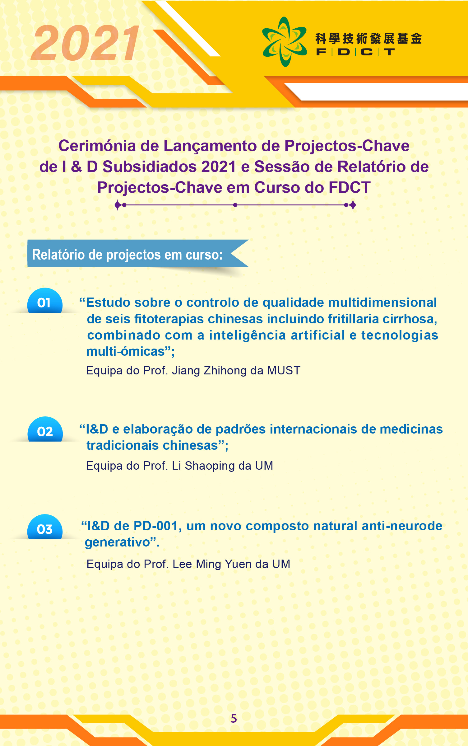 Realizou-se uma sessão de relatório imediatamente após a cerimónia de lançamento, na qual as equipas dos três projectos subsidiados no ano anterior foram convidadas para apresentarem o seu estado de investigação intermediária e os resultados faseados. Os projectos são: 1) O projecto da equipa do Prof. Jiang Zhihong da MUST, “Estudo sobre o controlo de qualidade multidimensional de seis fitoterapias chinesas incluindo fritillaria cirrhosa, combinado com a inteligência artificial e tecnologias multi-ómicas”; 2) O projecto da equipa do Prof. Li Shaoping da UM, “I&D e elaboração de padrões internacionais de medicinas tradicionais chinesas”; 3) O projecto da equipa do Prof. Lee Ming Yuen da UM, “I&D de PD-001, um novo composto natural anti-neurodegenerativo”.