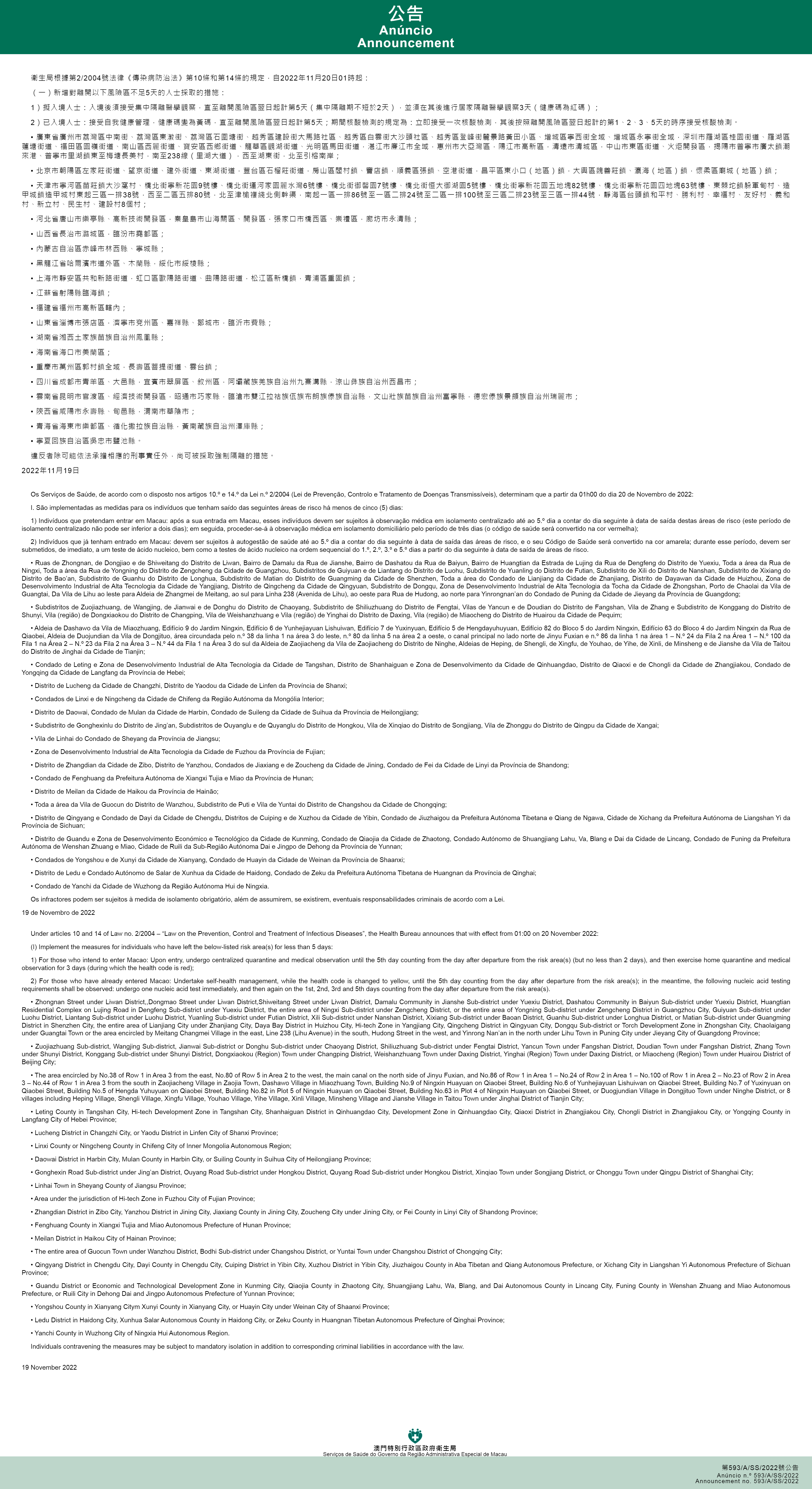 Tendo em consideração a evolução epidemiológica mais actualizada no Interior da China, os Serviços de Saúde, de acordo com o disposto nos artigos 10.º e 14.º da Lei n.º 2/2004 (Lei de Prevenção, Controlo e Tratamento de Doenças Transmissíveis), determinam que a partir da 01h00 do dia 20 de Novembro de 2022, são implementadas ou canceladas as medidas antiepidémicas para quem tenha estado em diversas áreas do Interior da China: