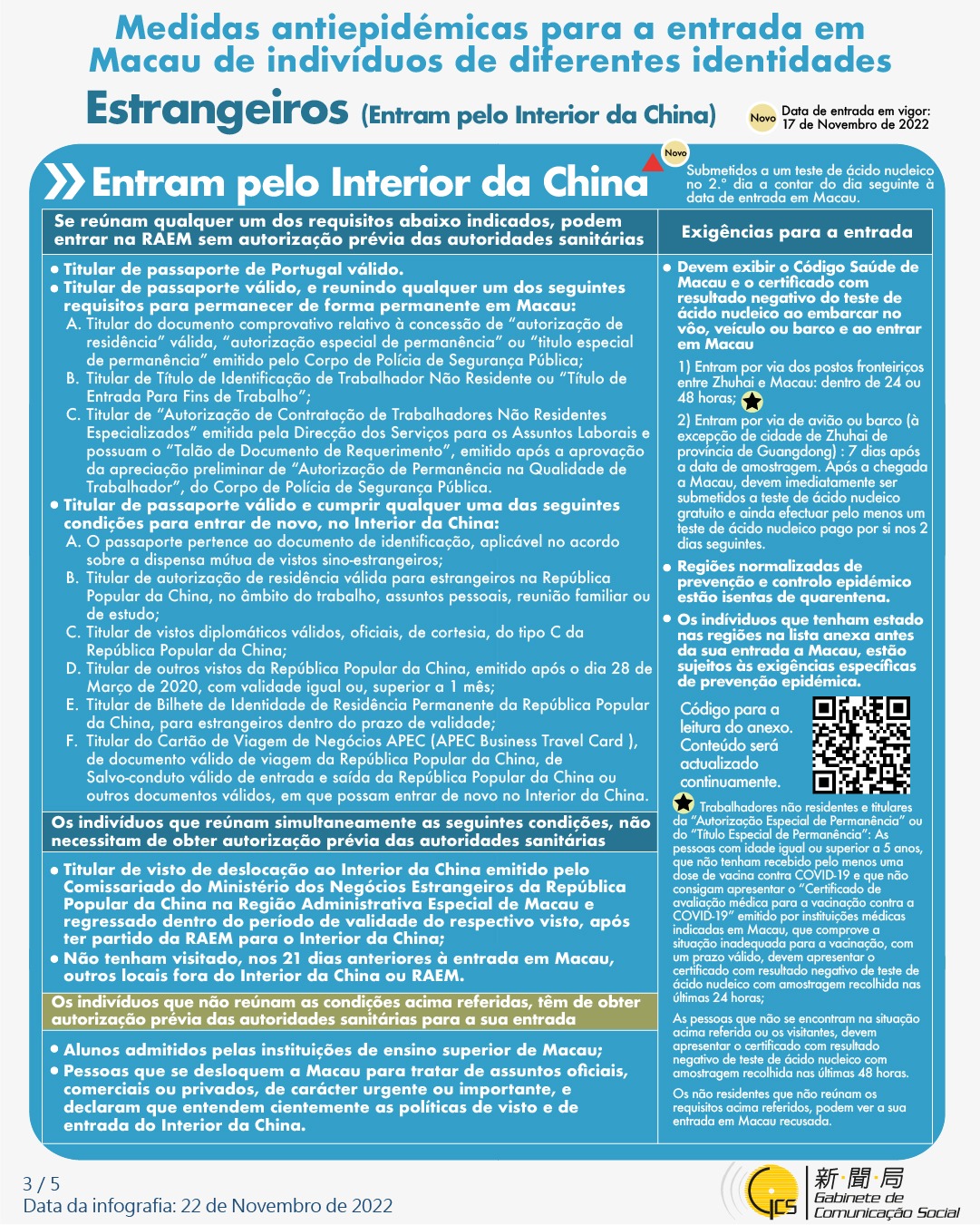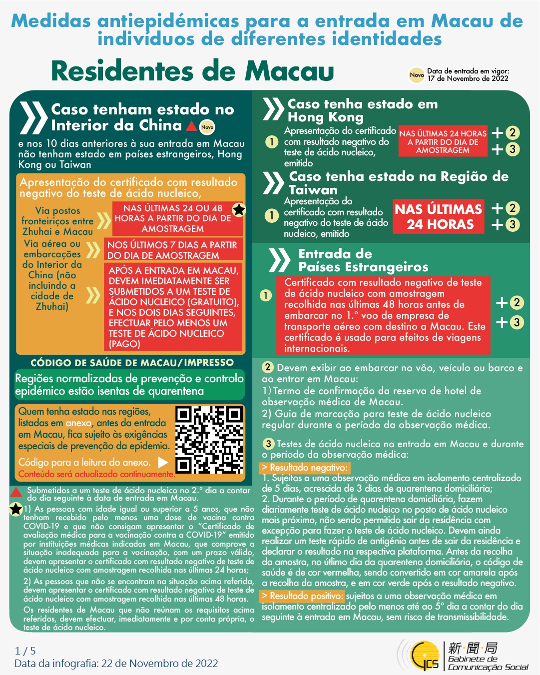 (Infografia) Medidas antiepidémicas para a entrada em Macau de indivíduos de diferentes identidades, actualizadas no dia 22 de Novembro de 2022.