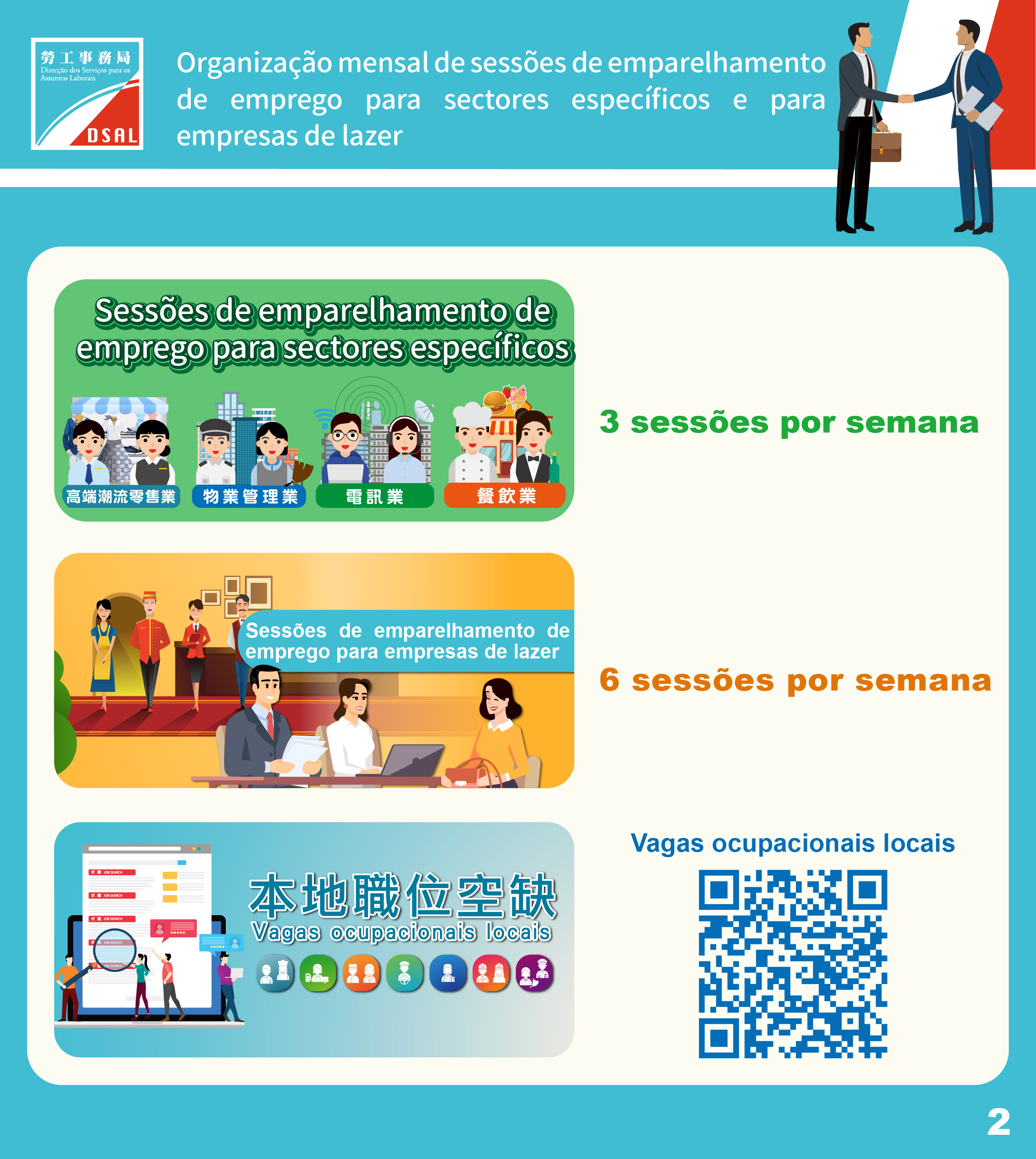 A partir do 4.° trimestre de 2020, com base nas sessões regulares de emparelhamento de emprego organizadas inicialmente, a DSAL começou a organizar mensalmente três sessões de emparelhamento de emprego para sectores específicos a fim de envidar mais esforços no emparelhamento de emprego. Em 2022, consoante as mudanças no ambiente de trabalho, o número das sessões tem vindo a aumentar gradualmente para três sessões por semana, e ao mesmo tempo, a DSAL lança mensalmente seis sessões de emparelhamento de emprego para empresas de lazer, a fim de proporcionar aos residentes diversas vagas de emprego em diferentes sectores.