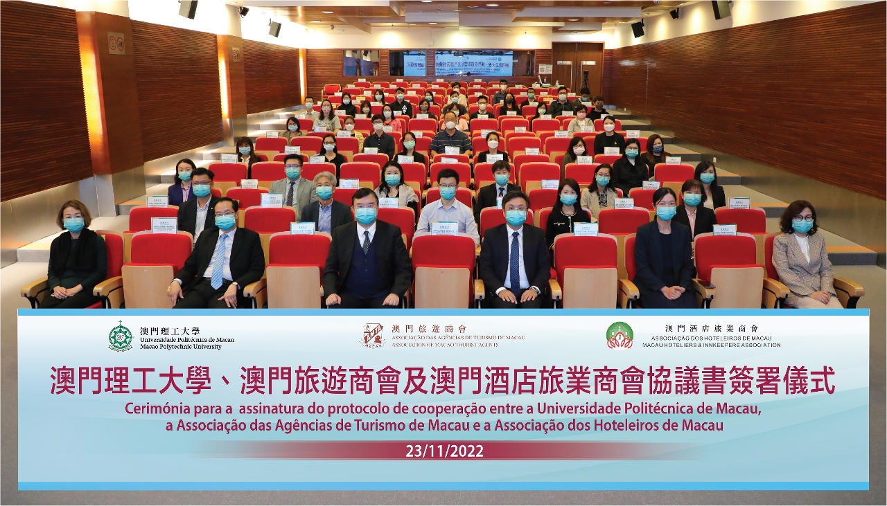 Em articulação com o posicionamento de desenvolvimento de Macau como “Um Centro, Uma Plataforma, Uma Base” e a promoção do desenvolvimento diversificado da economia de Macau, a Universidade Politécnica de Macau (UPM), a Associação das Agências de Turismo de Macau e a Associação dos Hoteleiros de Macau reuniram-se, no dia 23 de Novembro, pela manhã, no Edifício Wui Chi da mesma Universidade, para a realização da Cerimónia Solene de Assinatura do «Acordo-Quadro de Cooperação para Impulsionar a Base de Demonstração da Educação de Turismo e de Cultura, no Âmbito do Centro Mundial de Turismo e Lazer em Macau». Estiveram presentes o Reitor da UPM, Im Sio Kei, o Presidente da Direcção da Associação das Agências de Turismo de Macau e também Presidente da Associação dos Hoteleiros de Macau, Cheung Kin Chung,  os quais, em representação das respectivas partes, assinaram o Acordo-Quadro. As três partes irão reforçar a cooperação nos domínios do Turismo Inteligente, Formação para Professores, Turismo de Estudo, Inovação Científica e Tecnológica e Formação de Quadros Qualificados, no intuito de apoiar activamente a acção governativa do Governo da RAEM, alargar as actividades de marca “Educação+Turismo” de Macau e contribuir para a implementação das estratégias para desenvolver a diversificação adequada “1+4”.