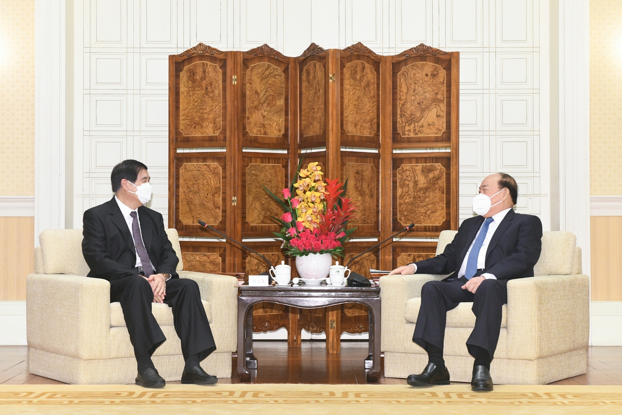 O Chefe do Executivo começou por dar as boas vindas ao presidente de All-China Federation of Taiwan Compatriots e à sua comitiva, tendo de seguida feito uma breve apresentação sobre o actual desenvolvimento económico de Macau. Afirmou que o surto da COVID-19 foi um golpe duro para a economia local, mas o Governo Central tem apoiado sempre Macau.Do mesmo modo que o governo de Macau tem-se esforçado para manter a prevenção e controlo da pandemia também lançou uma série das medidas em prol do bem-estar da população e de apoio à recuperação económica. Promoveu de forma pragmática a construção da Zona de Cooperação Aprofundada entre Guangdong e Macau em Hengqin e potenciou sinergias no densenvolvimento entre as quatro indústrias principais e as outras indústrias relacionadas na Zona de Cooperação Aprofundada, no sentido de incrementar a integração no desenvolvimento nacional. O mesmo responsável adiantou que o governo vai também aproveitar as vantagens institucionais do princípio «um país, dois sistemas», assim como esforçar-se para promover o desenvolvimento saudável das relações entre os dois lados do Estreito.